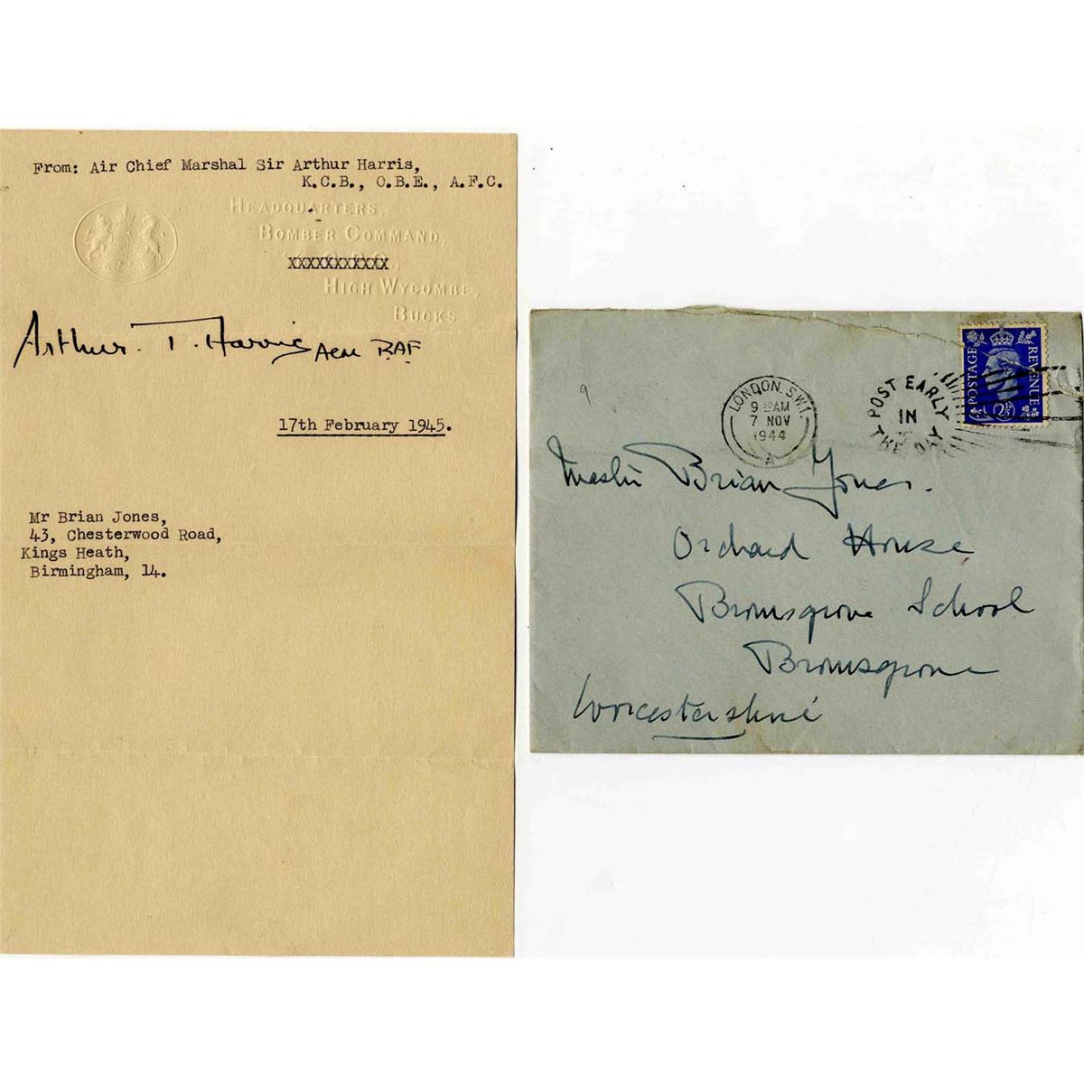 Note signed by British Air Chief Marshal Sir Arthur Harris. Signed boldly in black ink, ''Arthur T. Harris ACM RAF'' and dated 17 February 1945. The note bears the stamped royal seal and is embossed ''Headquarters, Bomb Command, c/o C.P.O., High Wycombe, Bucks.'' Addressed to Mr. Brian Jones in Birmingham, England. 4.75'' x 7.5'' note is folded in fourths and through the signature, which is still pristine. Near fine condition. With postmarked transmittal envelope.