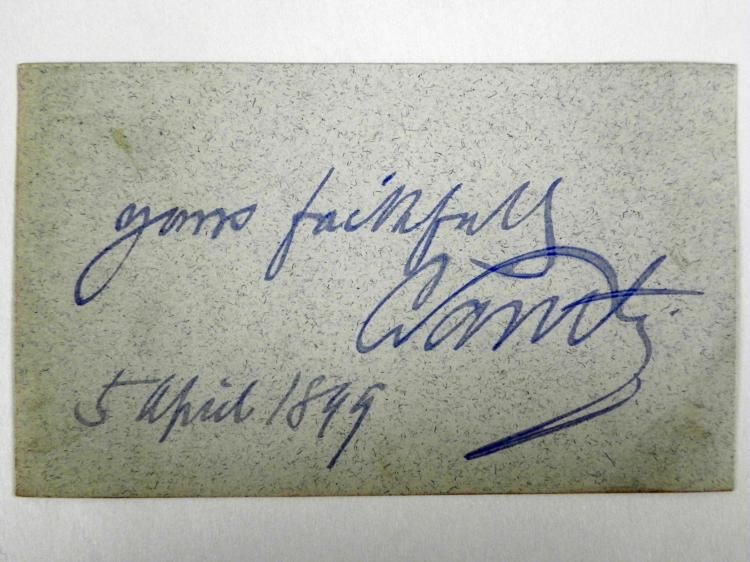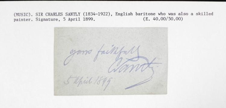 Offered here is a signed piece of paper by Sir Charles Santly. Sir Charles Santly (1834-1922) played the English baritone and was also a skilled painter. He signed it in a blue fountain pen and dated in April 5, 1899. It comes in a protective sleeve * and is in mint condition. *
