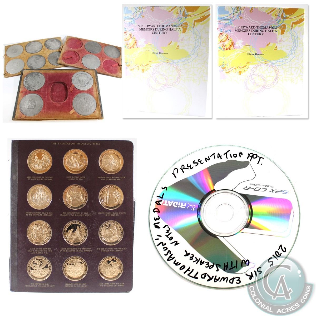 Sir Edward Thomason Medal Lot: 1. Sir Edward Thomason of Birmingham Scientific and Philosophical Medals. These medals were minted circa 1828 by Sir Edward Thomason, a noted manufacturer and inventor from Birmingham. Included with the original velveteen display are 13 of the 16 original medals, and one cover of the original book. These interesting medals have defined the related science, technology or philosophy with what was known at the time. You will receive Optics, Galvanism/Electricity, Hydrostatics/Hydraulics, Metallurgy/Specific Gravities, Astronomy, Minerology, Geology/Secondary Rocks, Crystallography, Mountains/Classification, Phrenology, Savery’s Steam Engine/High Pressure Engine, Mr. Watt’s Double-Acting Steam Engine, and Chemistry are included (Mr. Watt’s Single-Acting Steam Engine, Mechanics, Newcomen’s Steam Engine/Perkins’s Steam Engine are missing). Very Interesting piece of history 2. "The Thomason Medallic Bible" Bronze 19th Century Bible Medals by Sir Edward Thomason commemorated in modern and minted by the Franklin Mint, 12pcs, each 44 mm in diameter; PLUS 2-volumes (nearly 1,000 pages and lots of illustrations) Sir Edward Thomason’s Memoirs During Half a Century by Edward Thomason; PLUS computer disk with 2-files (Sir Edward Thomason Medals PowerPoint Show and Word file of accompanying Speaker’s Notes)