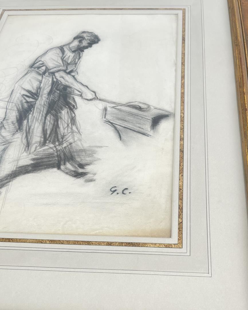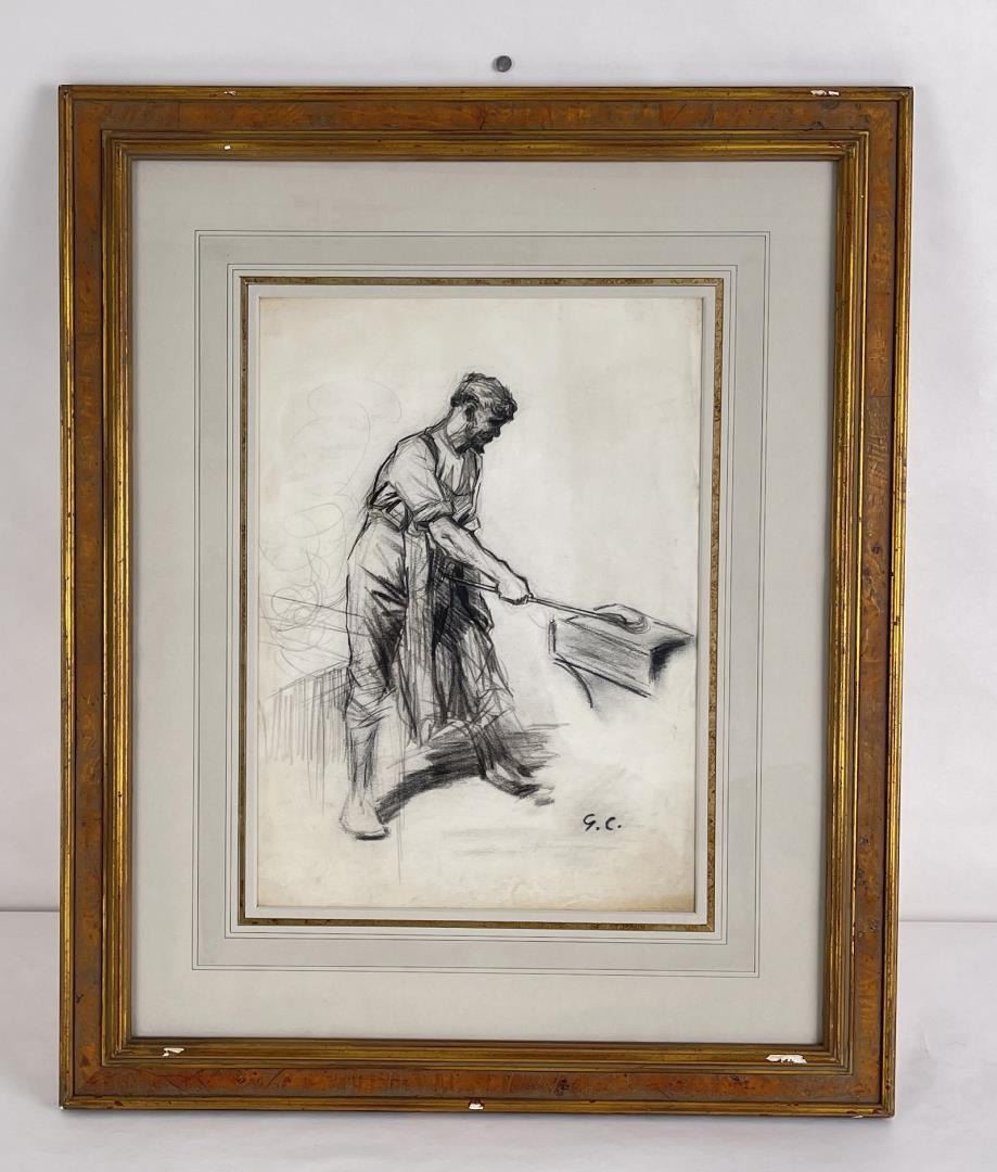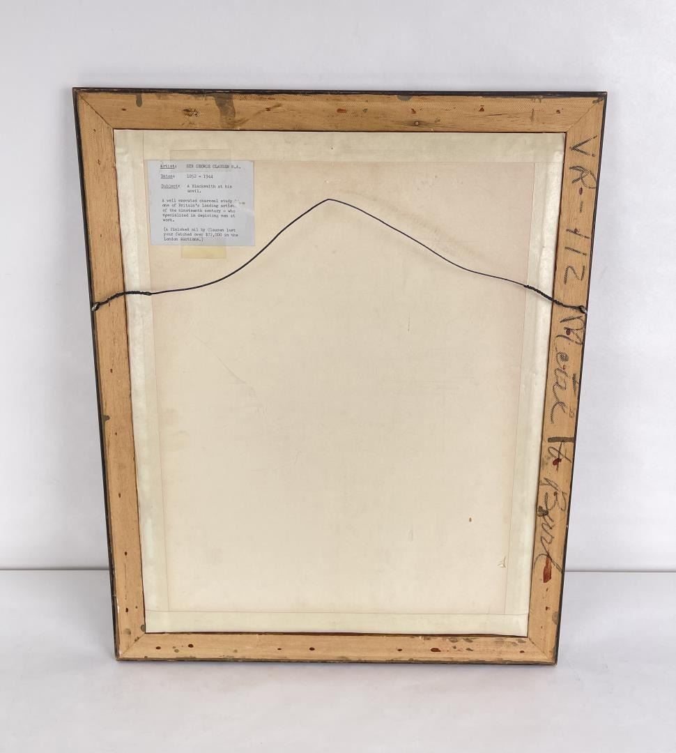 18 1/2" by 22 1/2" framed. Title is Blacksmith at his Anvil. George (Sir George) Clausen (1852 - 1944) was active/lived in Illinois / United Kingdom, England. George Clausen is known for Figure, landscape, and peasant genre paintings, etching, drypoint. A painter who earned much distinction for his landscape and modern-day peasant genre scenes, George Clausen also painted portraits and still life. Like the impressionists, Clausen subscribed to the idea that light was the most important subject of a painting, but his work, often with sparkling sunlight, was realist in style. He was born in London, and spent most of his career in that city. He was elected a full member to the Royal Academy in 1906, and was knighted as Sir George Clausen in 1927. His father, a decorative artist, was from Denmark, and his mother was Scottish. At age 14, he apprenticed to a London firm of decorators, Messrs Trollope, and while working there, attended the South Kensington Design School. Shortly after he earned a two-year scholarship to that school. He also worked in the studio of Edwin Long, a Royal Academy member, whom he met when he was sent to Long's home to decorate a door. In Europe, George Clausen, studied at the Antwerp Academy and with Professor Joseph Van Lerius (1823-1876), and during this time, he did painting along the Dutch coast. In Paris, he studied with Gustave Bouguereau and Robert Fleury. Clausen was also a Professor of Painting and a war artist during World War I. In 1929, his work was exhibited at the Art Institute of Chicago.