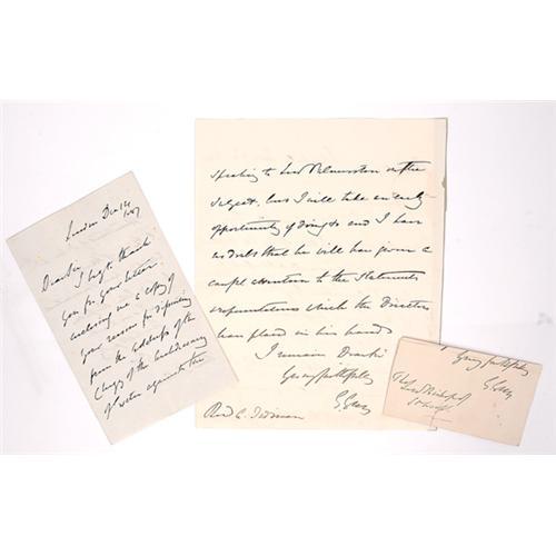 <Our item number 140099><B>Grey, Sir George.</B> (1812-1898) British colonial administrator in New Zealand, South Australia, and the Cape Colony Africa. He became a pioneer scholar of the Maori culture, writing a study of their mythology and oral history. Two autograph letters signed ("G. Grey") as Governor of New Zealand, and a cut signature with closing from a letter. One letter, datelined Whitehall, 1846, Nov. 24, 9 x 7 in., 2 pp., thanks Reverend A. Tidman for a copy of a Memorial addressed to Lord Palmerston by the Directors of the Missionary Society with reference to Tahiti. A strip of paper is affixed to front left margin. The second letter, datelined London, 1847, Dec. 14, 7 x 4½ in., 2 pp., acknowledges receipt of "a copy of your reasons for dissenting from the address of the Clergy of the Archdeacon of Exeter against the appointment of Dr. Hampden to the See of Hereford." All about fine. <BR>Estimated Value $400 - 600. <BR><BR>Our item number 140099<BR><IMA GES><P ALIGN="CENTER"><IMG SRC="http://www.goldbergcoins.net/liveauction/49jpegs/140099.jpg"> </P></IMAGES>