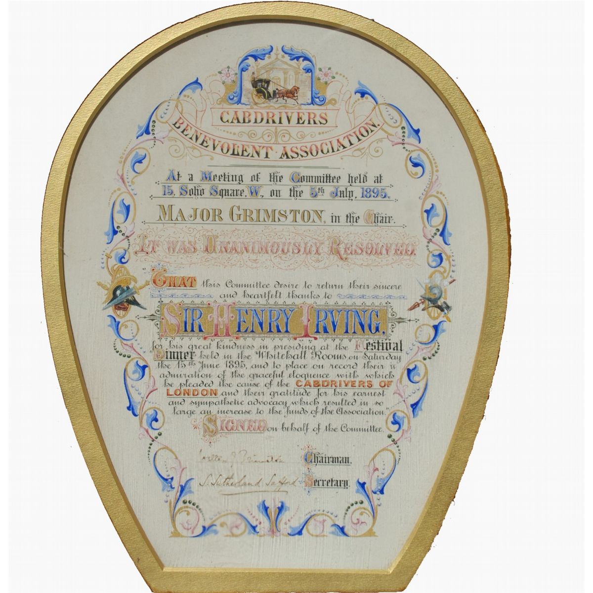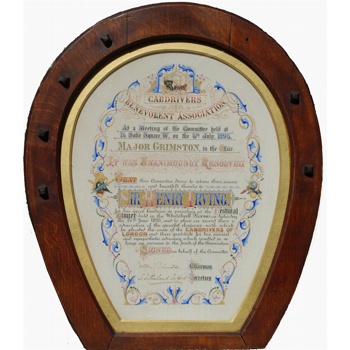 Sir Henry Irving, (born Feb. 6, 1838, Keinton Mandeville, Somerset, Eng.—died Oct. 13, 1905, Bradford, Yorkshire), one of the most famous of English actors, the first of his profession to be knighted (1895) for services to the stage. He was also a celebrated theatre manager and the professional partner of the actress Ellen Terry for 24 years. This is truly an amazing document. The art work of a cab driver with horse and the calligraphy throughout is done in hand with multi colors ink and even gold leaf to embellish the beautiful presentation to Sir Henry Irving for his support to the “Cab Drivers of London”. The document was given the same month that Sire henry Irving became the first in his profession to be knighted by the Queen Victoria.The document is housed in a hand made wood frame in the shape of a Horse shoe. The document reads in part: Cab drivers benevolent Association had a meeting of the committee held at 15 Soho Sq. W. on the 5 July 1895 Major Grimston in the chair it was Unanimously Resolved that this committee desire to return their sincere and heartfelt thanks to Sir Henry Irving for his great kindness in presiding at the festival winter held in the Whitehall rooms on the Saturday the 15 June 1895 and to place on record their admiration of the graceful eloquence with which he pleaded the cause of the cabdrivers of London and their gratitude for his earnest and sympathetic advocacy which resulted in so large increase to the funds of the association. This document was once part of the Forbes collection.