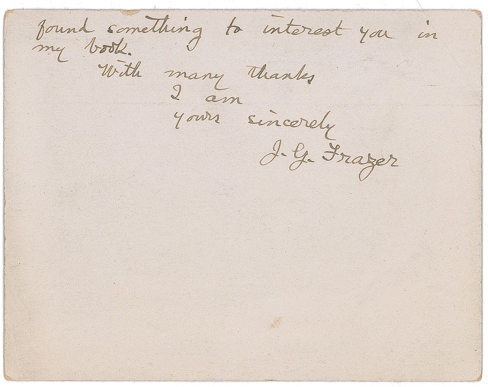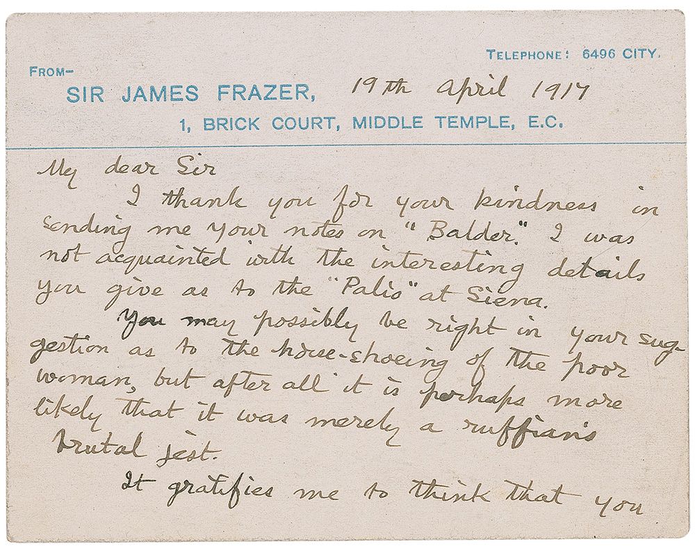 Scottish social anthropologist (1854–1941) influential in the early stages of the modern studies of mythology and comparative religion. ALS signed “J. G. Frazer,” one page both sides, 4.5 x 3.5, personal letterhead, April 19, 1917. In part: “I thank you for your kindness in sending me your notes on ‘Balder’ [a Norse god]. I was not acquainted with the interesting details you give as to the ‘Palio’ at Siena. You may be right in your suggestion as to the horse-shoeing of the poor woman, but after all it is perhaps more likely that it was merely a ruffian’s brutal jest.” In fine condition, with light scattered soiling and some trivial edge wear. Interesting reference to the famed Italian horse race, Palio di Siena.