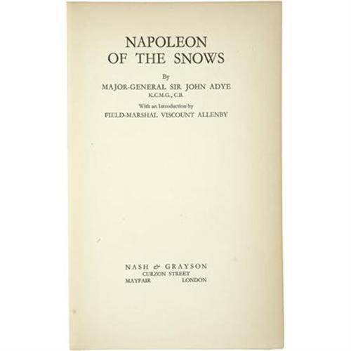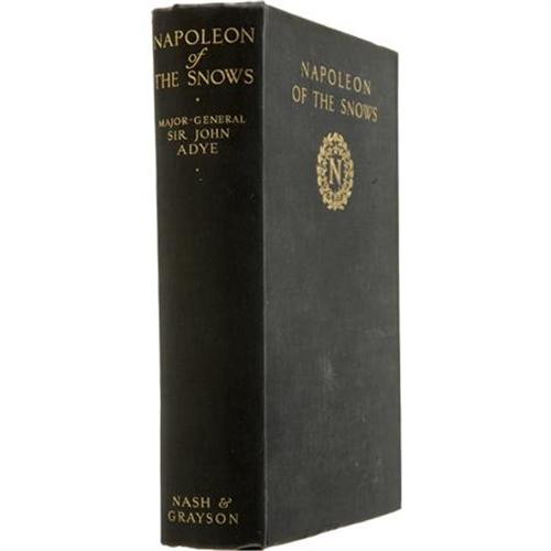 <B>Major-General Sir John Adye. </B></I><B><I>Napoleon of the Snow</B></I></B></I><B>.</B></I> By Major-General Sir John Adye. With an Introduction by Field-Marshal Viscount Allenby. London: Nash & Grayson, [1931]. <BR> <BR>First edition. Octavo. 279 pages. Sixteen inserted illustrations, including the frontispiece, one inserted foldout map. <BR><BR>Publisher's black cloth covers and spine lettered in gilt. Back hinge cracked but still sound, expected shelf wear, slight yellowing to page edges. Altogether a very good copy. <BR><BR>Major-General Sir John Adye clearly presents the psychological condition of a young and vibrant Napoleon Bonaparte at the dawn of the nineteenth century.<BR><BR><b>Shipping:</b> Books & Catalogs (<a target="_blank" href="http://www.heritageauctions.com/common/shipping.php">view shipping information</a>)