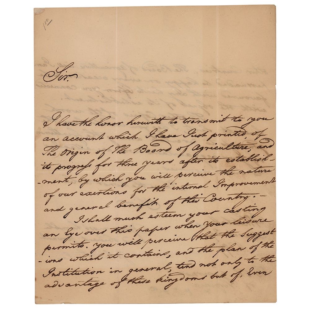 British politician, writer, and pioneering data collector and researcher (1754–1835) who introduced the word 'statistics' into the English language in his vast 21-volume work, Statistical Account of Scotland. LS, one page both sides, 7.75 x 9.75, March 29, 1797. Handwritten letter to "The Governor of Virginia," James Wood, in full: "I have the honor herewith to transmit to you an account which I have just printed, of the Origin of the Board of Agriculture, and its progress for three years after its establishment, by which you will perceive the nature of our exertions for the internal Improvement and general benefit of this Country. I shall much esteem your casting an Eye over this paper when you leisure permits. You will perceive that the suggestions which it contains, and the plan of the Institution in general, tend not only to the advantage of these kingdoms but of, even other Countries. The Board of Agriculture will I am persuaded be happy on every occasion to be favoured with any hints from you connected with the object of its establishment. The other Copies of the work herewith sent, I beg you would have the goodness to circulate among the Gentlemen of your acquaintance who are attached to such inquiries." In fine condition.