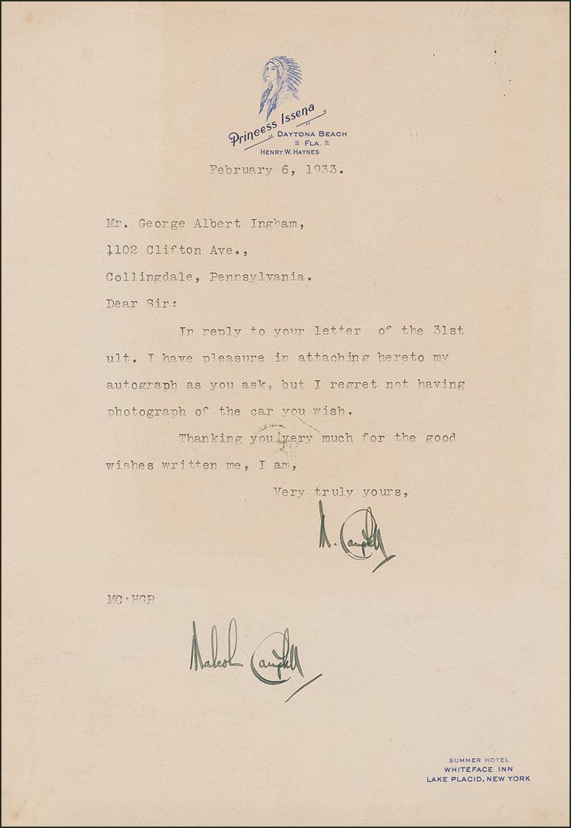 English auto and speedboat racer, he held the world's records for both land speed and water speed at several times during the 1920s and 1930s. TLS signed “M. Campbell,” one page, 7.25 x 10.5, Princess Issena letterhead from the Princess Issena Hotel in Daytona Beach, Florida which is where he set five land speed records between 1928 and 1935, February 6, 1933. Letter complying with an autograph request. In part: “In reply to your letter of the 31st ult. I have pleasure in attaching hereto my autograph as you ask, but I regret not having photograph of car you wish.” Campbell has also signed the bottom of the letter, “Malcolm Campbell.” In fine condition, with uniform light toning, some mild ink transfer from bottom signature to body of text, and some scattered light creases.
