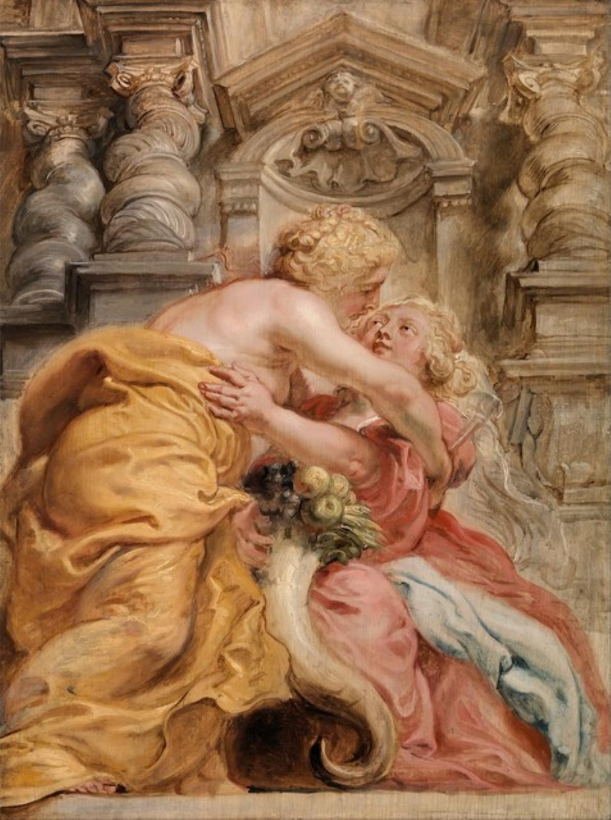 Artist: Sir Peter Paul Rubens - Title: Peace Embracing Plenty - Medium: Fine Art Reproduction Giclee on Canvas - Image Size: Approximately 32 inches x 23.75 inches - Unframed on Unstretched Canvas - Biography: Sir Peter Paul Rubens (28 June 1577 - 30 May 1640) was a Flemish artist and diplomat from the Duchy of Brabant in the Southern Netherlands (modern-day Belgium) who lived during the Dutch Golden Age. He is considered the most influential artist of the Flemish Baroque tradition. Sir Peter Paul Rubens's highly charged compositions reference erudite aspects of classical and Christian history. His unique and immensely popular Baroque style emphasized movement, colour, and sensuality, which followed the immediate, dramatic artistic style promoted in the Counter-Reformation. Sir Peter Paul Rubens was a painter producing altarpieces, portraits, landscapes, and history paintings of mythological and allegorical subjects. He was also a prolific designer of cartoons for the Flemish tapestry workshops and of frontispieces for the publishers in Antwerp.