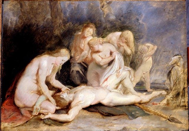 Artist: Sir Peter Paul Rubens - Title: Venus Mourning Adonis - Medium: Fine Art Reproduction Giclee on Canvas - Image Size: Approximately 22 inches x 32 inches - Unframed on Unstretched Canvas - Biography: Sir Peter Paul Rubens (28 June 1577 - 30 May 1640) was a Flemish artist and diplomat from the Duchy of Brabant in the Southern Netherlands (modern-day Belgium) who lived during the Dutch Golden Age. He is considered the most influential artist of the Flemish Baroque tradition. Sir Peter Paul Rubens's highly charged compositions reference erudite aspects of classical and Christian history. His unique and immensely popular Baroque style emphasized movement, colour, and sensuality, which followed the immediate, dramatic artistic style promoted in the Counter-Reformation. Sir Peter Paul Rubens was a painter producing altarpieces, portraits, landscapes, and history paintings of mythological and allegorical subjects. He was also a prolific designer of cartoons for the Flemish tapestry workshops and of frontispieces for the publishers in Antwerp.
