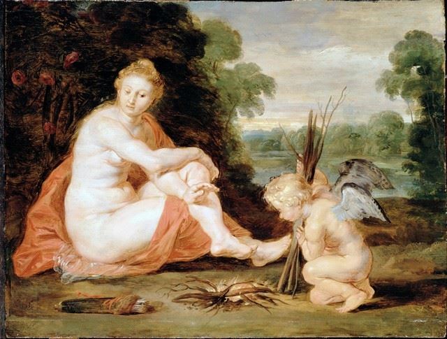 Artist: Sir Peter Paul Rubens - Title: Venus and Cupid Warming Themselves - Medium: Fine Art Reproduction Giclee on Canvas - Image Size: Approximately 24.25 inches x 32 inches - Unframed on Unstretched Canvas - Biography: Sir Peter Paul Rubens (28 June 1577 - 30 May 1640) was a Flemish artist and diplomat from the Duchy of Brabant in the Southern Netherlands (modern-day Belgium) who lived during the Dutch Golden Age. He is considered the most influential artist of the Flemish Baroque tradition. Sir Peter Paul Rubens's highly charged compositions reference erudite aspects of classical and Christian history. His unique and immensely popular Baroque style emphasized movement, colour, and sensuality, which followed the immediate, dramatic artistic style promoted in the Counter-Reformation. Sir Peter Paul Rubens was a painter producing altarpieces, portraits, landscapes, and history paintings of mythological and allegorical subjects. He was also a prolific designer of cartoons for the Flemish tapestry workshops and of frontispieces for the publishers in Antwerp.