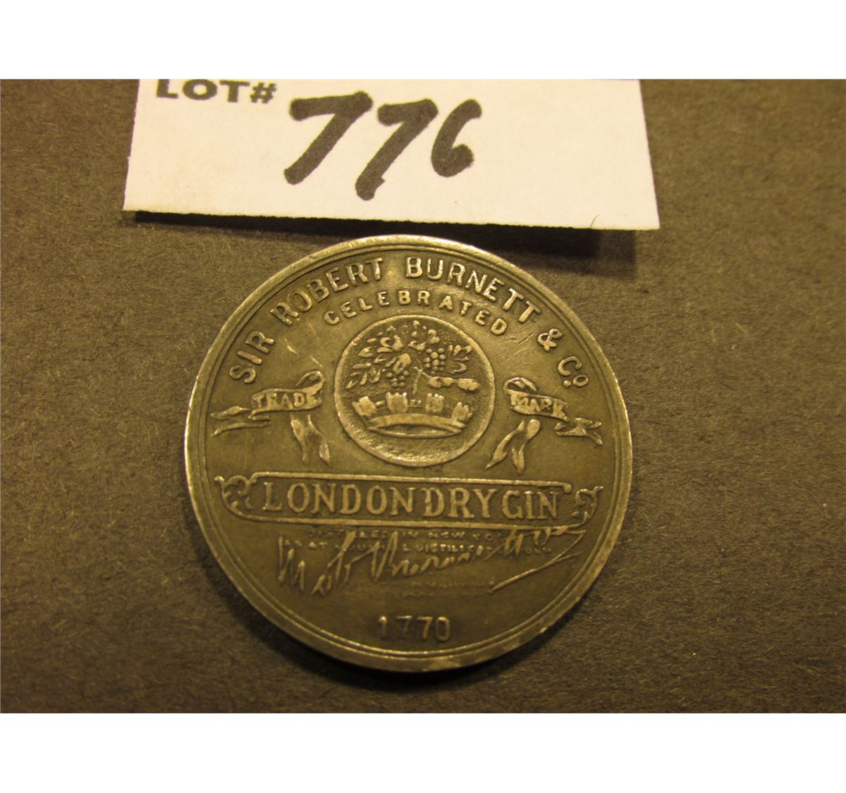 "Sir Robert Burnett & Co./Celebrated/London Dry Gin/…/1770", marked "STERLING" on rim, VF, with very minor rim bumps.
