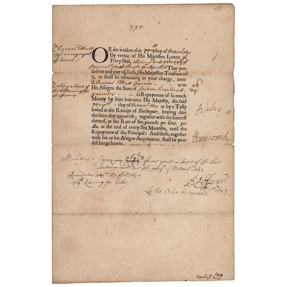 English playwright and politician (1626–1698) who fought for the Royalist cause in the English Civil War. Scarce partly-printed DS, signed “Ro: Howard,†one page, 9.25 x 14.25, February 1673. Loan order requesting the delivery and payment "of such His Majesties Treasure as is, or shall be remaining in your charge, unto Thomas Elliott Esquire—or to His Assigns the Sum of seven hundred pounds in Repayment of so much Money by him lent unto His Majesty…as by a Tally levied at the Receipt of Exchequer…together with the Interest thereof, at the Rate of Six pounds per Cent. per An. at the end of every Six Months, until the Repayment of the Principal: And these, together with his or his Assigns Acquittance, shall be your discharge herein." Signed at the conclusion by Howard. In fine condition, with trivial paper loss along two of the three horizontal folds.
