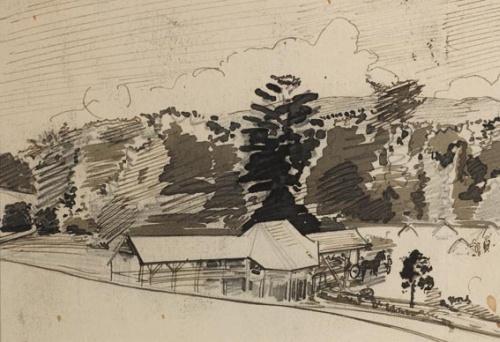 FARM BUILDINGS NEAR MONEYMORE, LOOKING TOWARDS SLIEVE GALLION, COUNTY TYRONE inscribed and with studio stamp on reverse pen and ink on paper <BR>9 by 12cm., 3.5 by 4.75in. <BR><b>Provenance:</b><BR> Artist's studio sale, Phillips, 11 June 1991