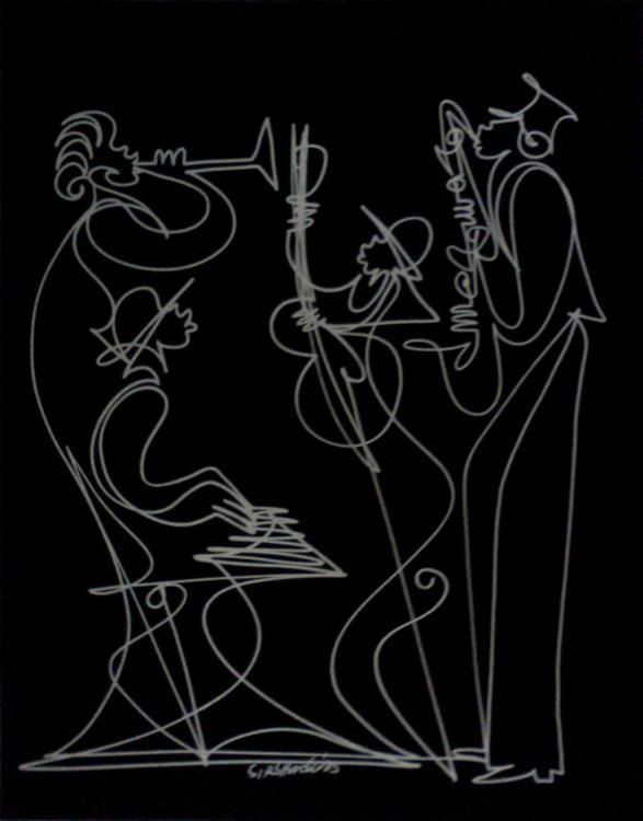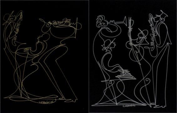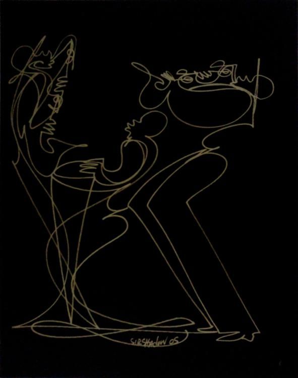 Artist: Sir Shadow Title: Jazz MusicianMedium: Double-sided one-line drawings; silver ink on black paper, verso gold ink on black paperDate: 2005Full size: 24 x 18 3/4 inchesImage size: 24 x 18 3/4 inchesBiographySir Shadow is a unique 21st century artist