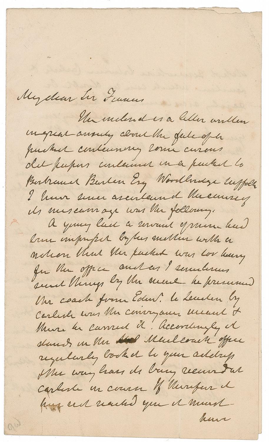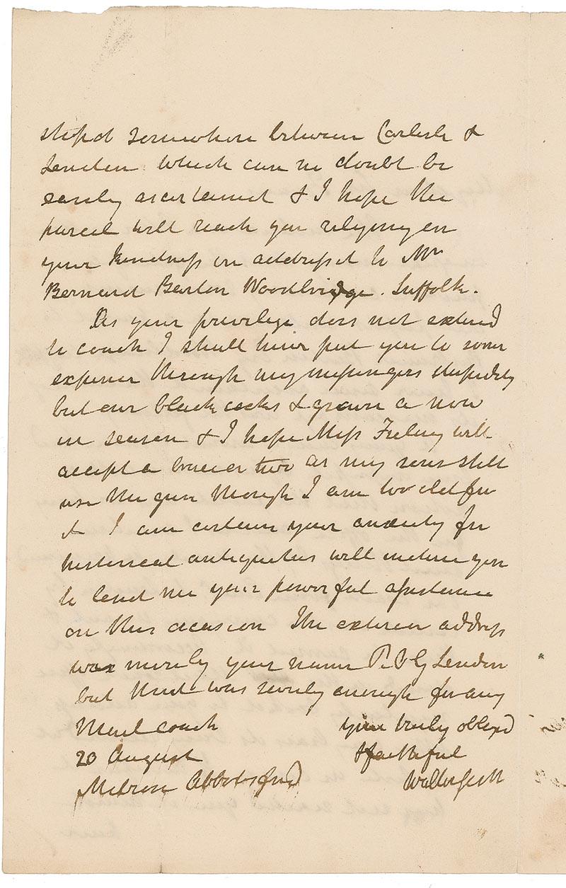 Scottish novelist and poet (1771–1832) best known for such classics as Ivanhoe, Rob Roy, and Waverley. ALS, one page both sides, 4.5 x 7.25, August 20, 1830. Letter to Sir Francis. In full: “The enclosed is a letter written in great anxiety about the fate of a packet containing some curious old papers contained in a packet to Bernard Burton Esq Woodbridge Suffolk. I have since ascertained the cause of its miscarriage was the following: A young lad a servant of mine - had been impressed by his mother with a notion that the packet was too heavy for the office, and as I sometimes send things by the mail he presumed the coach was the conveyance meant & there he carried it. Accordingly it stands in the mailcoach office regularly booked to your address & the way braes do busy received at Carlisle in cours [e was erased]. If therefore it had not reached you it must have stopped somewhere between Carlisle & London which can no doubt be readily ascertained & I hope the parcel will reach you relying on your kindness and addressed to Mr. Bernard Burton Woodbridge Suffolk. As your privilege does not extend to coach I shall have put you to some expense through my messengers stupidity but our black cocks & grouse a now in season & I hope Miss Freling will accept a brace or two as my sons still use the gun though I am too old for it. I am certain your anxiety for his torical antiquities will induce you tolend me your powerful assistance on this occasion. The exterior address was merely your name P.O.G. London but that was truly enough for any mailcoach.” In very good condition, with intersecting folds, uniform mild toning, some light wrinkling and creasing, and light mirroring of signature on second integral page.