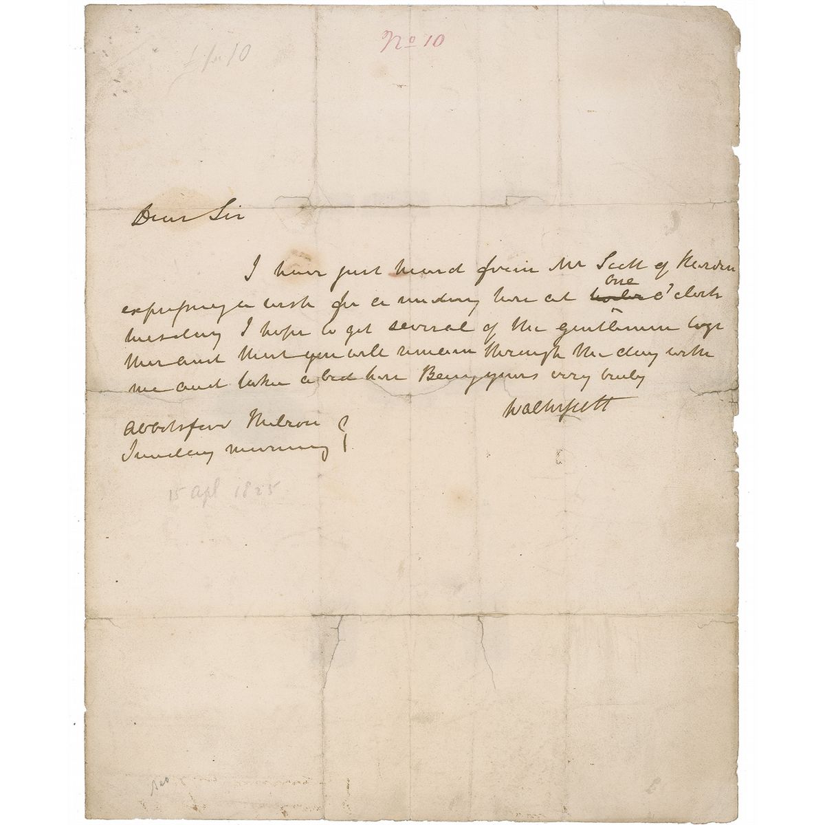 Scottish novelist and poet (1771–1832) best known for such classics as Ivanhoe, Rob Roy, and Waverley. ALS signed “Walter Scott,” one page, 8 x 9.75, no date. Letter to a gentleman, in Scott’s difficult to decipher hand. In part: “I have just heard from Mr. Scott…expressing a wish for a working lunch at one o’clock Tuesday I hope to get several of the gentlemen together and that you will remain through Monday with me and a bed here.” In good condition, with intersecting folds, one through a single letter of signature, multiple old tape repairs to folds on reverse, several partial fold separations and tears, toning and soiling, scattered light edge wear, and several ink and pencil notations.