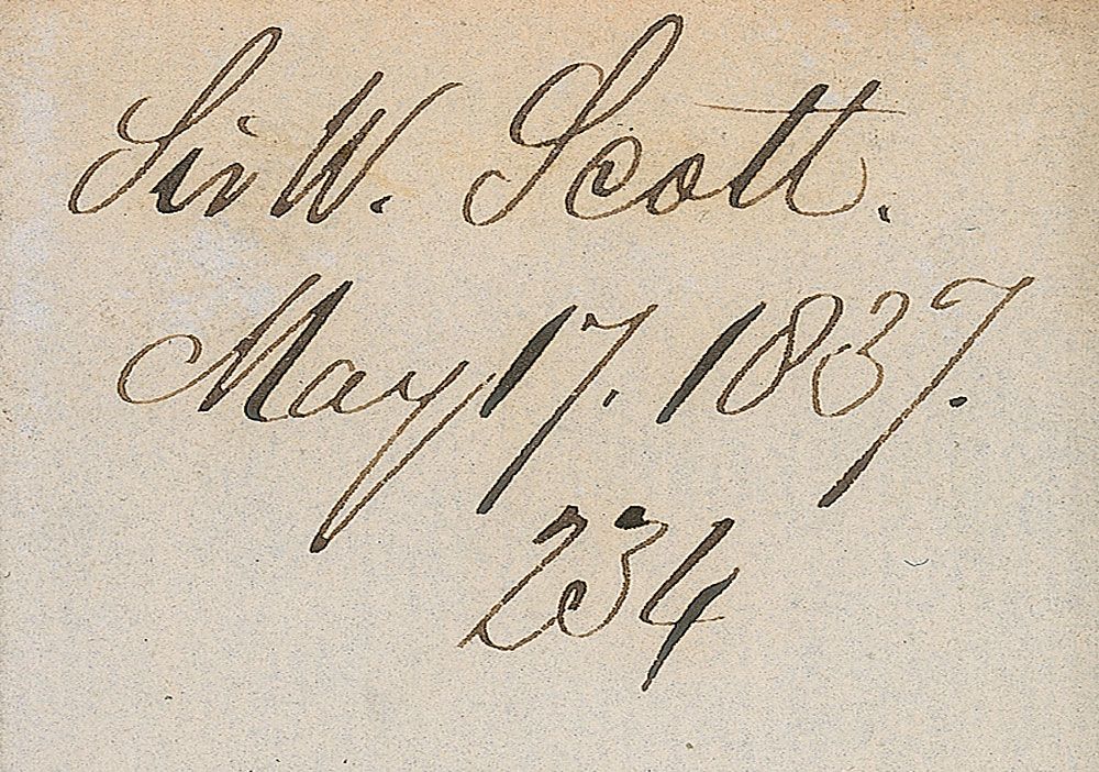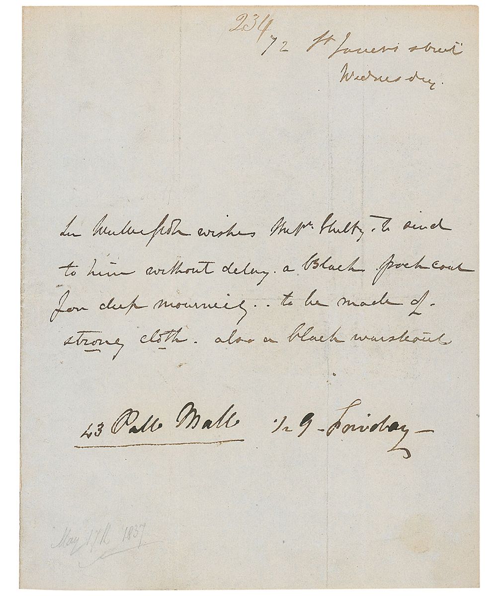 Scottish novelist and poet (1771–1832) best known for such classics as Ivanhoe, Rob Roy, and Waverley. Third-person ALS, one page, 7.25 x 9.25, [May 17, 1837]. Scott requests a coat. In full: “Sir Walter Scott wishes Messrs. Shultz to send to him without delay a black frock coat for deep mourning, to be made of strong cloth. Also a black waistband.” Address panel to reverse of second integral sheet is also filled out in Scott’s hand. Intersecting folds (one vertical fold passing through a single letter of the signature), light overall toning, and a few pencil notations, otherwise fine condition.