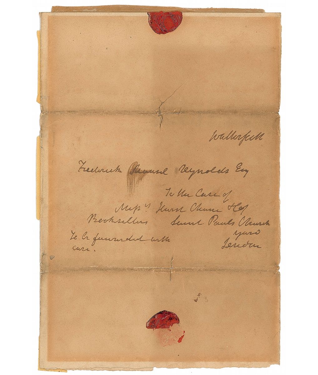ALS signed “Walter Scott,” one page, 7.25 x 9, April 9, 1829. Letter to dramatist Frederick Mansel Reynolds. In part: “I cannot I think express myself more clearly respecting the manner in which I am willing to fulfill my engagement with you.” In very good condition, with intersecting folds with a partial separation to the right edge and a moderate block of toning. Accompanied by the original mailing cover addressed in Scott’s hand, as well as an unsigned engraved portrait.
