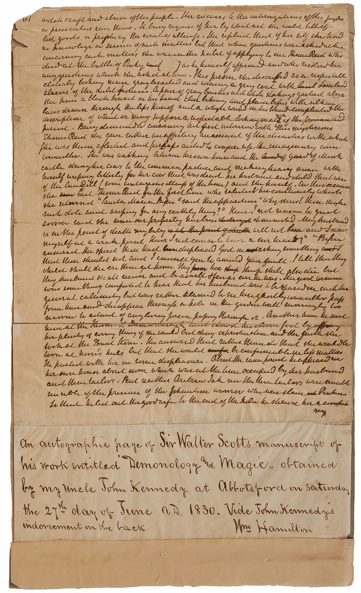 Handwritten manuscript fragment, unsigned, one page, 8 x 10.25, no date but circa 1830. A page from the draft for Scott’s Letters on Demonology and Witchcraft. In part: “Witchcraft, and abuse of the people. Her answers to the interrogatories of the judges or prosecutors ran thus. It being required of her, by what art she could tell of lost goods, or prophesy the event of illness. She replied, that of herself she had no knowledge or science of such matters, she was in the habit of applying to one Thome Reid, who died at the battle of Pinkie…as he himself affirmed, and who resolved her any questions which she asked of him.” Affixed to a slip bearing a notation concerning the origin of the page, which is subsequently affixed to a larger mount. In very good to fine condition, with two small tears from ink erosion, and several other similar professionally reinforced splits and tears. Scott had been fascinated with demonology and witchcraft since childhood and over the years he tirelessly researched and read about the subjects. Surveying opinions respecting demonology and witchcraft from the Old Testament period to his own day, Scott’s Letters on Demonology and Witchcraft became an overwhelming commercial success.