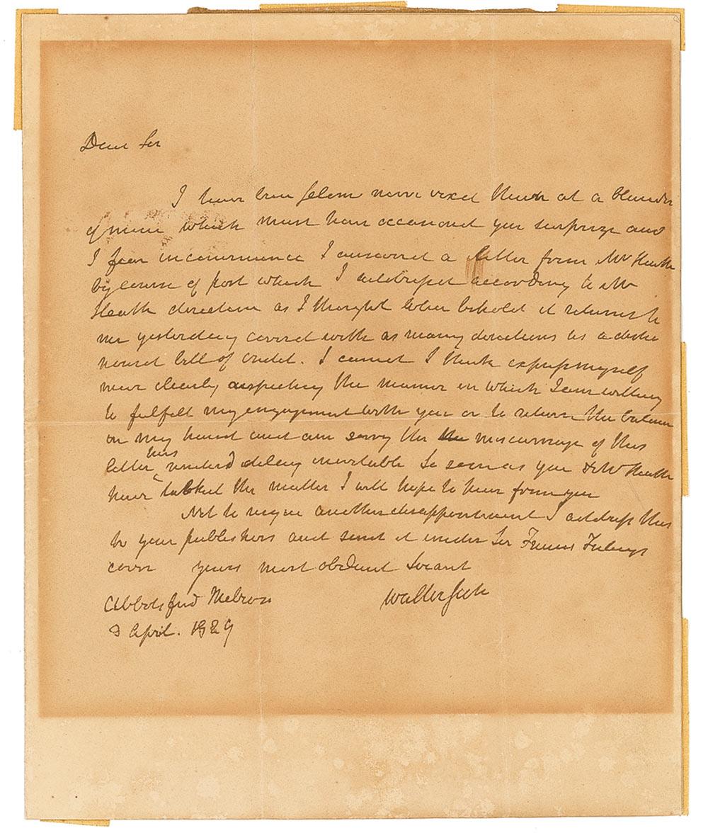 Scottish novelist and poet (1771–1832) best known for such classics as Ivanhoe, Rob Roy, and Waverley. ALS, one page, 7.25 x 9, April 8, 1829. Letter in Scott’s difficult to decipher hand attempting to correct a mailing error. In part: “I have been…vexed much at a blunder of mine which must have incurred your surprise and I fear inconvenience. I answered a letter from Mr. Heath by error of post which I addressed according to Mr. Heath’s direction as I thought when behold it returns to me yesterday with…many directions.” In good condition, with partial separations along fragile intersecting folds, uniform moderate toning from previous display, and some scattered light soiling. Accompanied by a separate address panel, which may be the letter referenced by Scott.