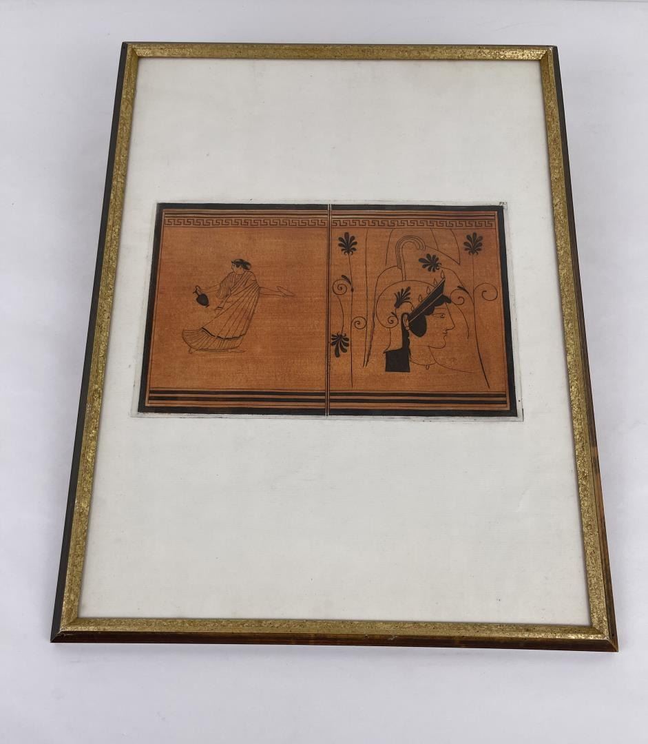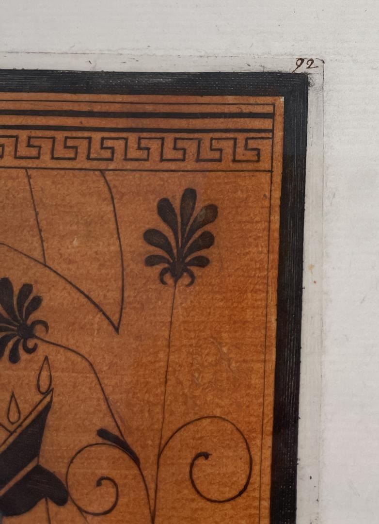 14" by 19" framed. 1763 aquatint engraving/etching from the collection of Sir William Hamilton. Hamilton was the ambassador to Italy and had a collection of the worlds finest Green and Roman vases which he eventually sold to the British Museum. Before moving them to the museums collection he wanted to catalog the works in these etchings and engravings, hiring Pierre-Francois Hugues d'Hancarville. The resulting catalog, Les Antiquités d'Hancarville, represents a neoclassical masterpiece.