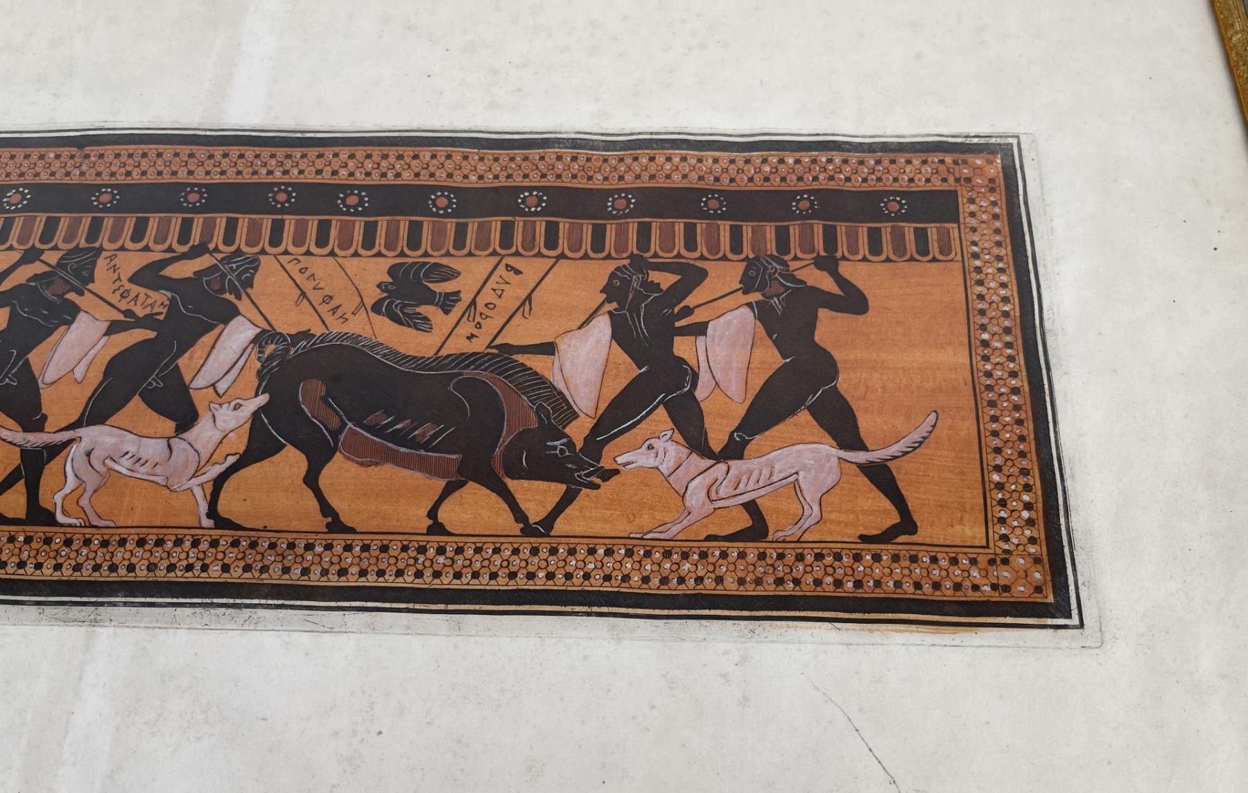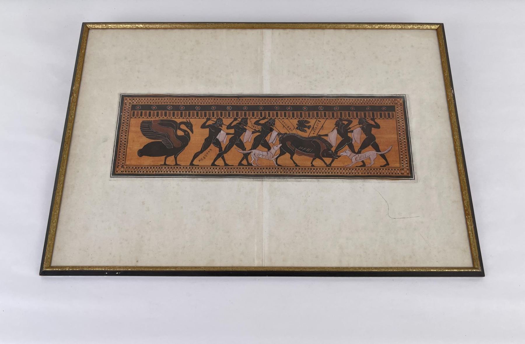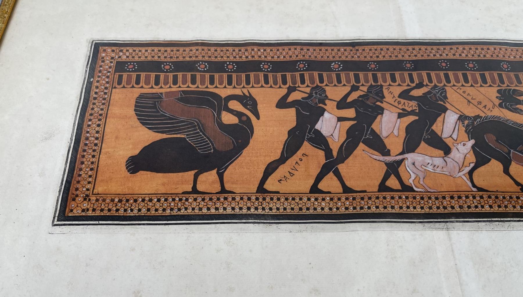 19 1/2" by 27 3/4" framed. 1763 aquatint engraving/etching from the collection of Sir William Hamilton. Hamilton was the ambassador to Italy and had a collection of the worlds finest Green and Roman vases which he eventually sold to the British Museum. Before moving them to the museums collection he wanted to catalog the works in these etchings and engravings, hiring Pierre-Francois Hugues d'Hancarville. The resulting catalog, Les Antiquités d'Hancarville, represents a neoclassical masterpiece.