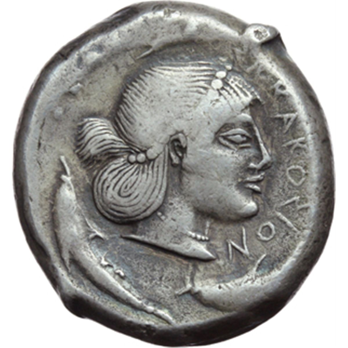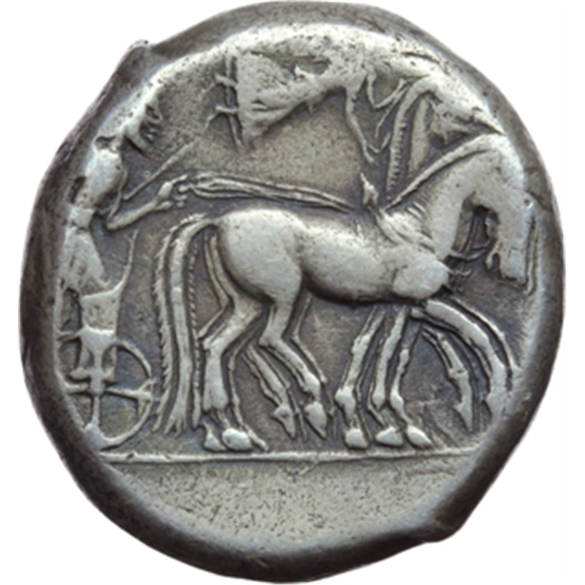 Mondo Greco. Sicilia. Siracusa. Tetradracma, 475-470 a.C. D/ Quadriga al passo a destra, condotta da auriga. Sopra, Nike vola a destra e incorona i cavalli. R/ ΣYRAKOΣION con prima Σ retrograda. Testa di Arethusa a destra. Intorno, quattro delfini. Cfr. Boehringer 321 var. AG. g. 17.21 mm. 23.00 Bel BB+. Un esemplare molto attraente.