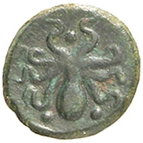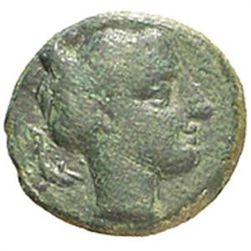 Sicilia. Siracusa. Trias, 465-425 a.C. D/ Testa di Arethusa a destra. Dietro, un delfino. R/ Polipo. Nel campo, tre globetti. SNG ANS 376. gr. 2.74 AE. BB/BB+. Bellissima patina verde smeraldo.