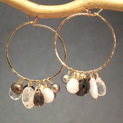 Metal: GoldHammered hoops with 9 assorted neutral colored removable stones.eutral stone set includes: black onyx, smoky quartz, labradorite, clear quartz, clear cubic zirconia, white agate, peacock pearl, grey pearl, moonstone.Small hoops 3/4" diameterLarge hoops 1-1/2" diameterAvailable in either 14K gold-filled, rose gold-filled, or sterling silver. All jewelry is entirely handmade in our studio in New York.