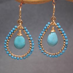 Metal: Gold Hammered hoops with your choice of stone (blue turquoise, aquamarine, amethyst, lapis, and tanzanite shown), about 1-3/4" long. Available in either 14K gold-filled, rose gold-filled, or sterling silver. All jewelry is entirely handmade in our studio in New York. Rondelle Teardrop