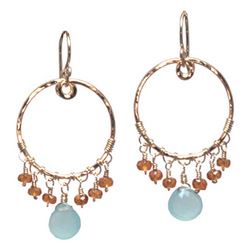Metal: RoseGoldHammered circles with dangling mandarin garnet and sea blue chalcedony, about 1-3/4" long. Available in either 14K gold-filled, rose gold-filled, or sterling silver. All jewelry is entirely handmade in our studio in New York.