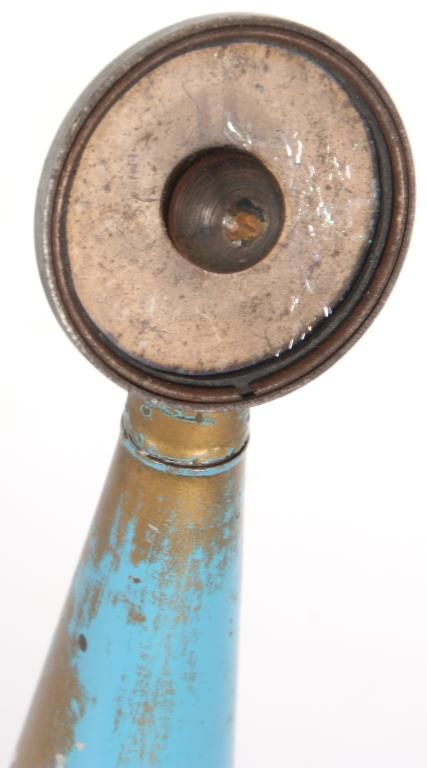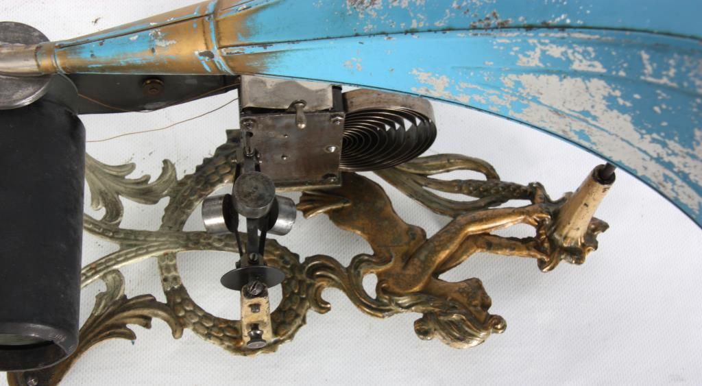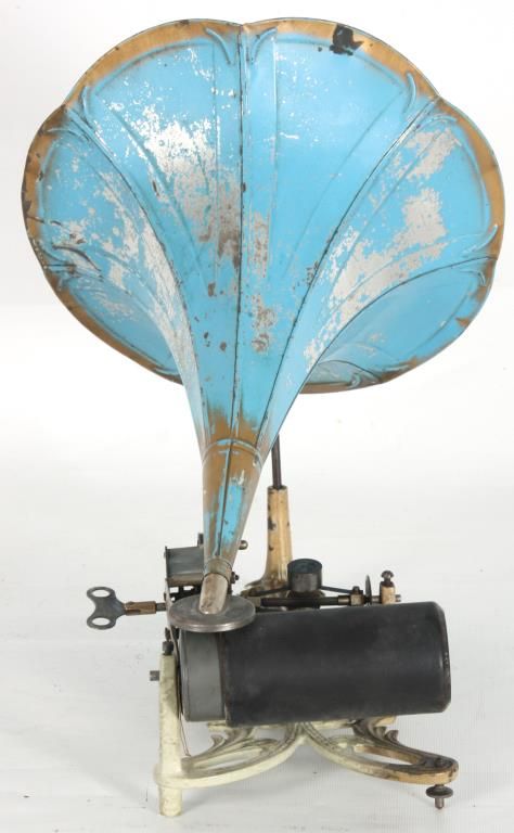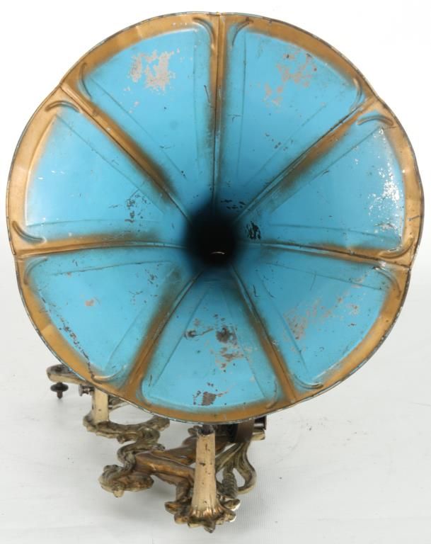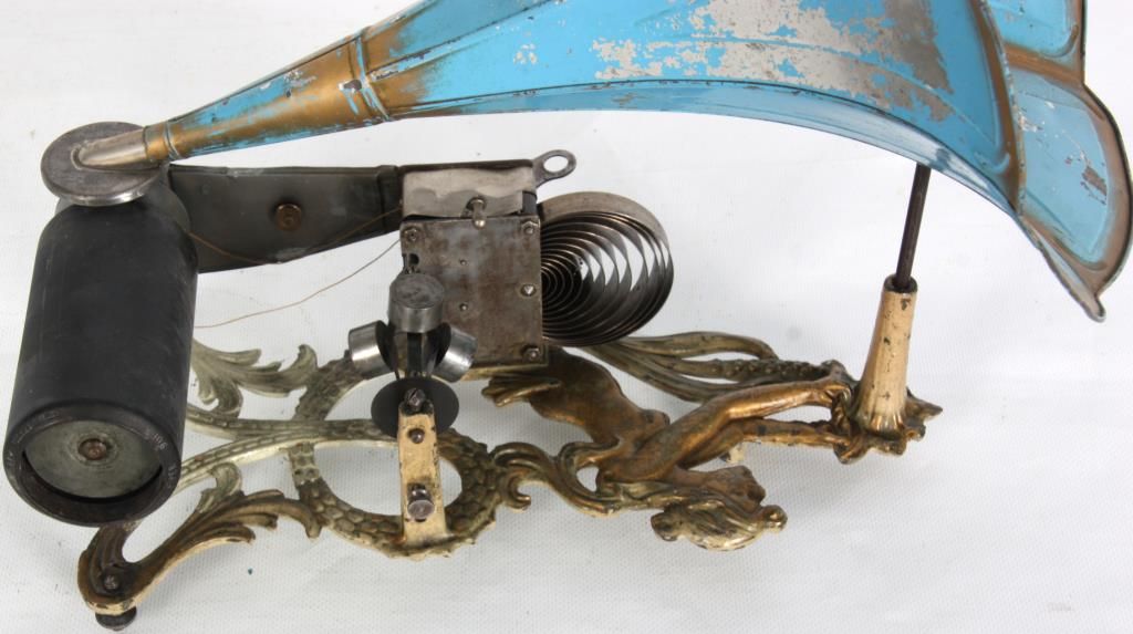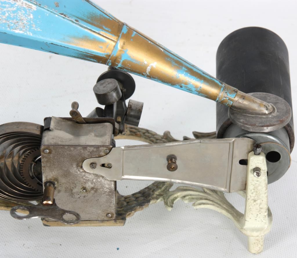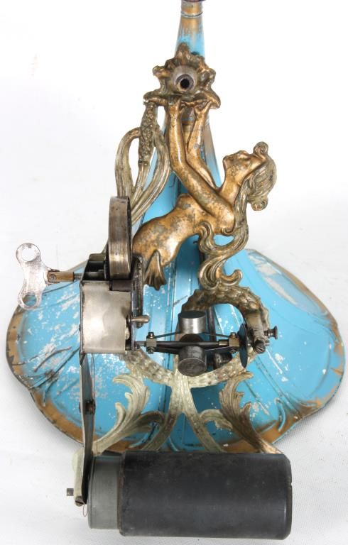 Siren Cast Iron Cylinder Phonograph. The cast iron bedplate is a nouveau figural mermaid with scrolling double tail, skeletonized spring driven mechanism with key wind on the front and 7 panel lobed horn, painted blue with gilt trim, 11 in. long x 10 in. dia. Some paint loss to the base and some scratching and paint loss to the horn. 14 in. high x 14 in. wide x 6 in. deep.