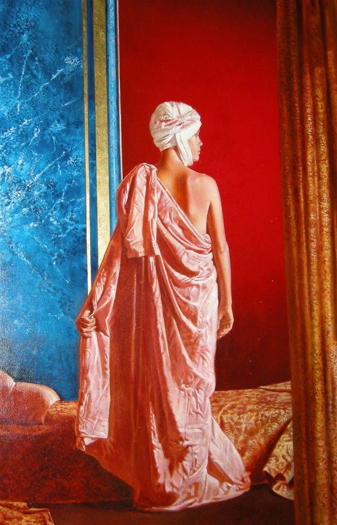 The back of a woman standing, dressed in a rumpled sheet and head covering in front of vivid red and blue walls, reveals Angelo Vadala's unique compositional style in this oil on canvas. The painting measures 59 x 39; framed image measures approx. 71 x 51