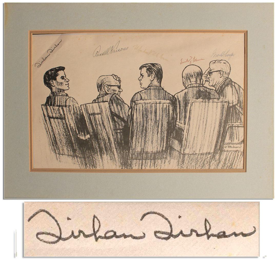 Signed print of a courtroom sketch from the trial of Robert Kennedy's assassin, Sirhan Sirhan. Print shows Sirhan Sirhan seated at far left beside his defense team with signatures reading, from left to right: ''Sirhan Sirhan'', ''Russell E. Parsons'', ''Michael McCowan'', ''Emile Z. Berman'' and ''Grant B. Cooper''. Accompanied by a Letter of Authenticity from defense investigator Michael McCowan. Sketch measures 16.5'' x 10.5'' and is matted to an overall size of 22.75'' x 15.75''. Toning and some foxing throughout, else fine condition.