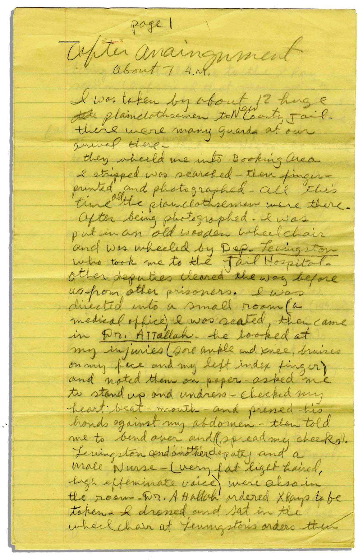 Never before seen and previously confidential trial notes handwritten by Robert Kennedy's assassin, Sirhan Sirhan, with extensive memories about his booking in jail. Five full pages of detailed notes of his medical examination and jail booking after the murder, with highlights including: ''…I was taken by about 12 huge plainsclothsemen [sic] to New County Jail. There were many guards at our arrival there. They wheeled me into booking area. I stripped was searched, then finger-printed and photographed. All this time all the plainclothsemen were there. After being photographed, I was put in an old wooden wheelchair and was wheeled by Dep. Levingston who took me to the Jail Hospital. Other deputies cleared the way before us from other prisoners. I was directed into a small room (a medical office). I was seated, then came in Dr. Attallah. He looked at my injuries (sore ankle and knee, bruises on my face and my left index finger) and noted them on paper, asked me to stand up and undress, checked my heartbeat, mouth, and pressed his hands against my abdomen, then told me to bend over and (spread my cheeks). Levingston and another deputy and a male nurse (very fat, light haired, high effeminate voice) were also in the room. Dr. Attallah ordered X Rays to be taken. I dressed and sat in the wheelchair at Levingston's orders then Levingston wheeled me to the X Ray section (I observed that many patients were seated on benches awaiting treatment as we left Dr. Attallah's room.) The fat male nurse mentioned accompanied us. The X Ray attendant was Negro -- he seemed to be friendly. Levingston or the fat nurse gave him a a sheet of instructions, then placed me on the X Ray table and started to X Ray the injured parts of my body -- while all along talking to Levi as he called Levingston. They talked about grades of tests in school. After the X Raying, I was wheeled by Levi and the fat nurse to another section of the hospital (a large room with many nurses) where I was weighed (109 pounds). There the fat nurse asked me if I was Syrian. I denied it by saying (No Comment) - then I was wheeled from there to a far end of the hall where they took my blood sample. The attendant who extracted the blood was Negro medium built 25 - 35 years. Other people were in the area. After this I was put in the wheelchair and taken to a cell. Along the way we stopped, Levingston was bussy [sic] with something and in the meantime Dr. Crehan, as I knew his name to be later passed by me, looked at me, and asked me if I had breakfast. I did not answer. Following this I was taken in an elevator to the second floor where I was put in a cell (# 7005?) Levingston was with me all the time. He was not in the cell -- but he kept watch on me intermittenly [sic]. They took my jail clothes and gave me some brown pajamas -- soon after that they brought me a breakfast (boiled eggs -- bread oats coffee orange juice) I didn't get it. Dr. Crehan knew that I am an Arab - and said that Dr. Attallah is also an Arab - he asked me if I were a (Nazrani) meaning Christian in Arabic / he asked me if I knew were [sic] the part of Alexendretta [sic] was - I did not reply then he said that I probably was too young at the time to remember it. He said he was planning to go to that part of the world (the Middle East) in 1957 when he was in Paris but he had to cancel the trip because there was an assassination in Bagdad [sic]. He planned to go to Bagdad - I felt that he was trying to prompt a reaction from me - I don't think he did - He also mentioned liquar [sic] and drugs 'L.S.D.' - then he started leaving…The same morning Pitchess came up, wished me 'good luck' and told me that I'll be protected and that if I had any complaints, to tell him directely [sic] through the chain of command - I asked him for the morning papers and he promised to bring them. In the meantime A.L. Wirin (ACLU) came up - I asked if he was Jewish. Yes he said. I was disheartened - but he assured me of his legal interest in me. I identified myself to him - during his visit Pitchess came back with the newspapers - Pitchess assured us that the cell is not bugged / Later in the afternoon, a Mr. Garfunkel came from the P.D.'s office - He was a Jew. The second morning they took a urine sample…Plake - he told me that he knew that I wanted to be a jockey. I did not comment - then he asked me if I liked booza, I asked what booza was - he explained that it was an Egyptian liquor like beer - I acted disinterested and complained of abdominal pains and physical depletion - he asked if I was married I didn't answer then he asked if I was homosexual - at that I became mad and said no. Mr. Wirin came up that morning so when Crehan heard that he hurriedly left…I wonder if Mr. Wirin saw the piece of cotton that they gave me to rub off the blood with.'' Manuscript, measuring 8'' x 12.5'' on 5pp. (written in pencil on front sides only) is stapled at top left. Near fine.