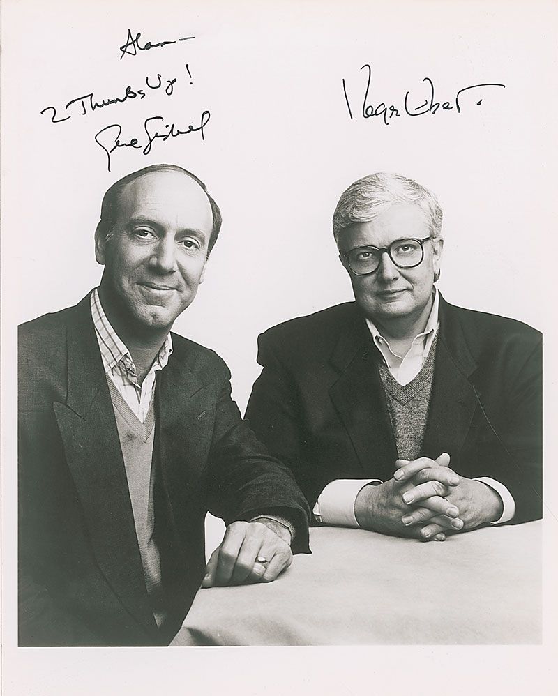 Satin-finish 8 x 10 photo of the critics, signed and inscribed in black felt tip, “Alan—2 Thumbs up! Gene Siskel,” and “Roger Ebert.” In fine condition.