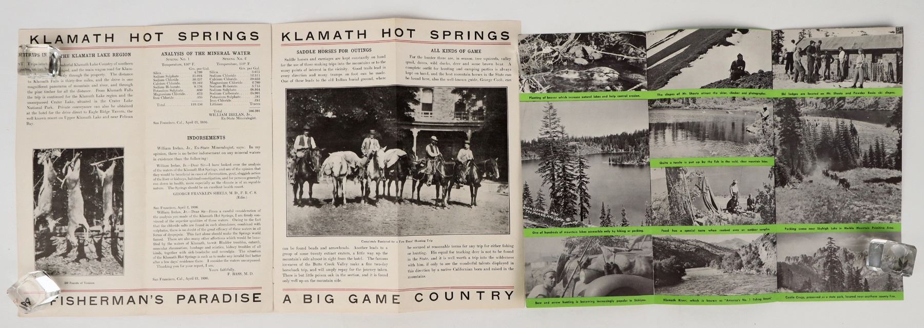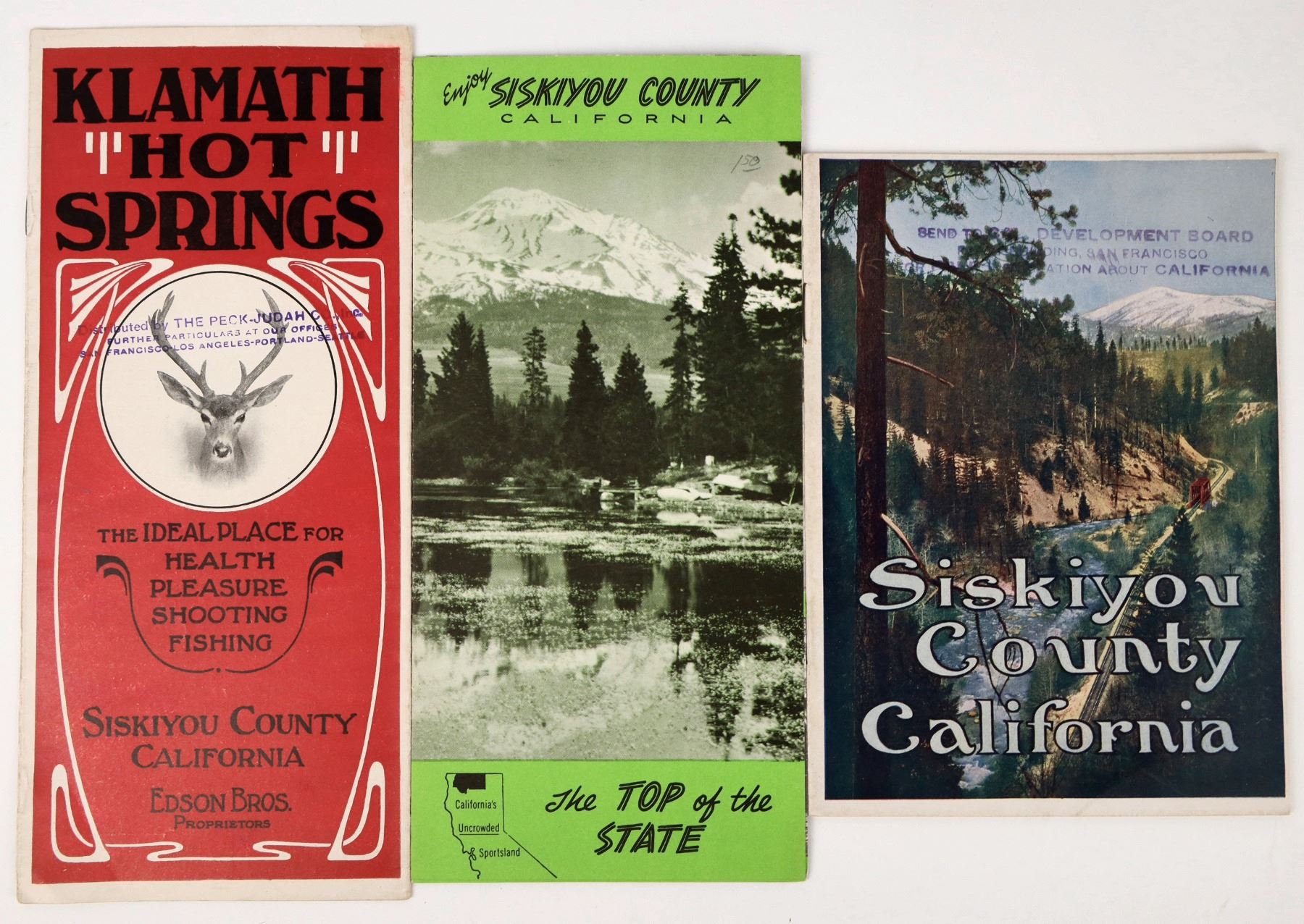 Lot of (3). In the realm of Mount Shasta, the top of the State as proclaimed on one item. Consists of a Siskiyou County Booklet, dated 1908. Illustrated with photos, it describes the county's resources, towns, lands and opportunities. Tri-fold photo spread of the wealth of activities in Siskiyou by the Yreka City Hall, and a Klamath Hot Springs resort flyer from the Edson Bros. All are in very good condition.