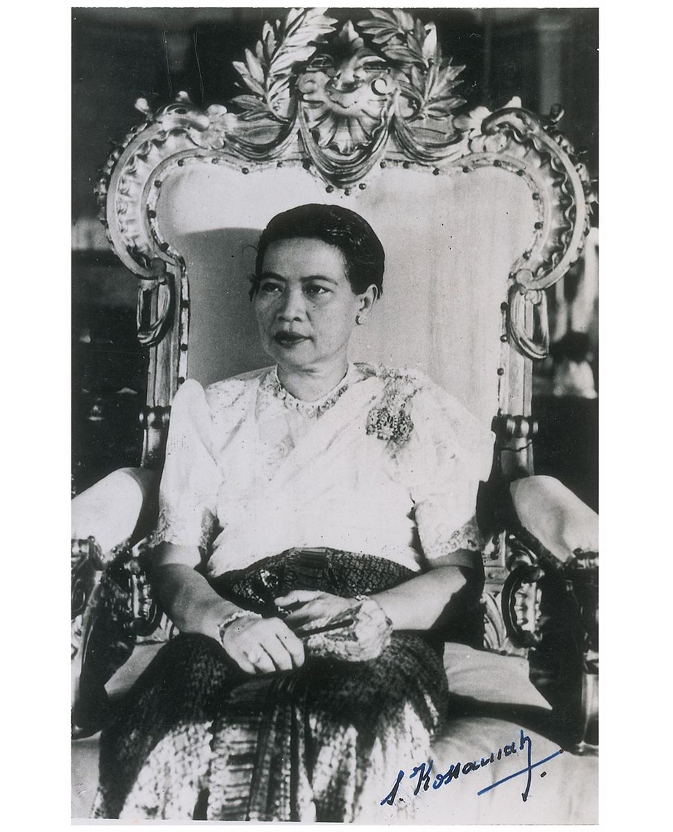 Queen consort of Cambodia from 1955 to 1960 as the wife of King Norodom Suramarit (1904–1975). Uncommon glossy 3.5 x 5.5 photo of Sisowath Kossamak on her throne, signed in dark blue ink. In fine condition, with scattered surface marks and impressions.