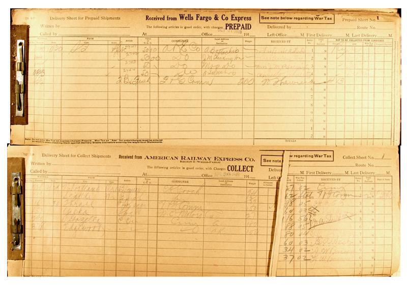 Two Large books, 6 x 17" containing several hundred pages each of prepaid shipment records of packages sent from the Wells Fargo Sisson, CA office, 1918 and 1919. Both appear complete, which is unusual. "lest Wagonmen forget" instructions for wagon men adhered on front inside cover. There is space for twelve line entries per day, but usually only half are filled out each day.