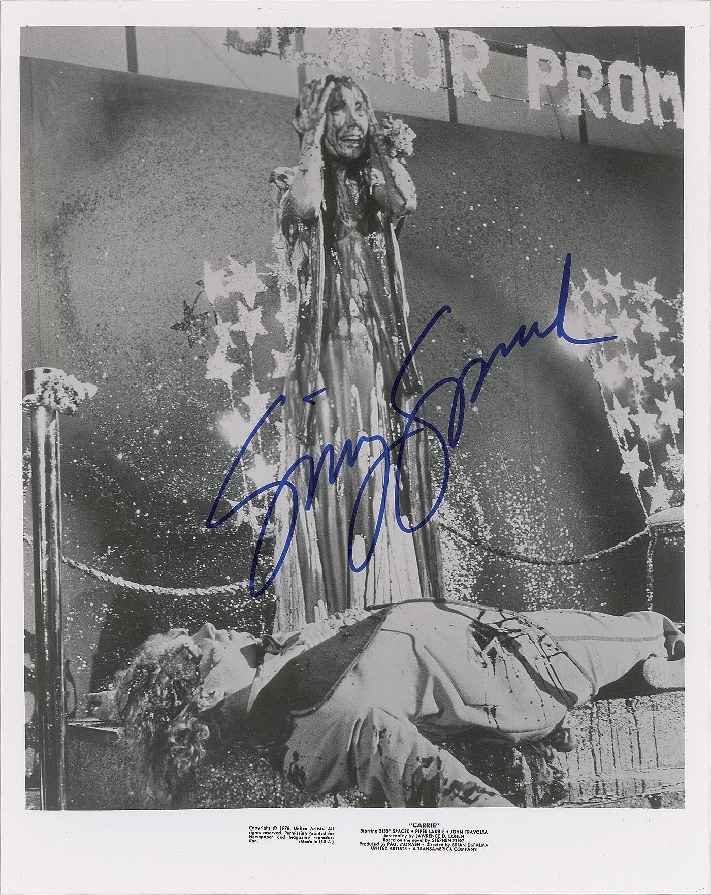 Glossy 8 x 10 United Artists publicity photo of Spacek as the blood-covered titular character from the 1976 supernatural horror film Carrie, signed in blue felt tip. In very fine condition. Originally obtained by in-person specialist Mike Wehrmann.