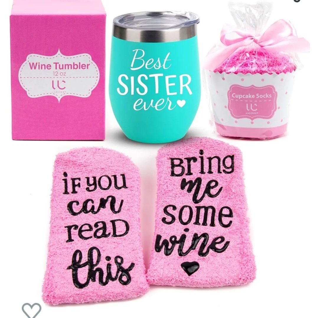 best sister ever wine tumbler, with cupcake wine socks, color is not identical to picture cup is light pink, new