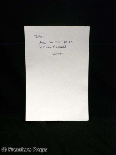 Carmen's (America Ferrera) note to Tibby reading "Tib: Here are the pants. Nothing happened. - Carmen" on white paper (approx. 9" x 6")