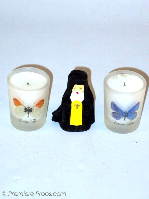 2 Small Candles & Ceramic Priest (candles are 2" tall, each has butterfly print on glass / priest is 2 1/4" tall) (used as set decoration)