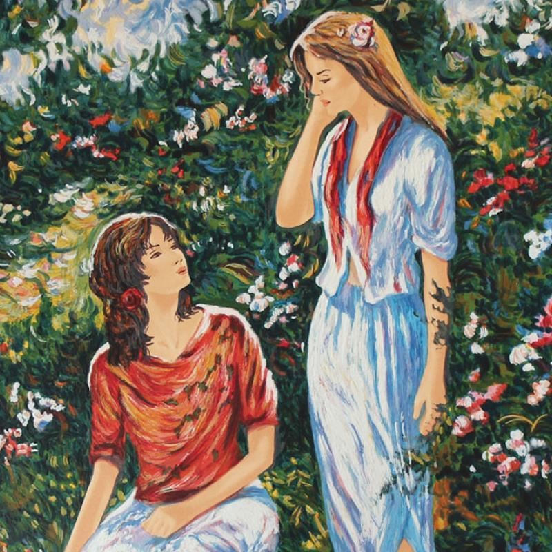 "Sisters" is a limited edition Serigraph on Paper by Igor Semeko. The piece is numbered, hand signed by the artist, and come with a letter of authenticity. Measures approximately 19.5" x 16".