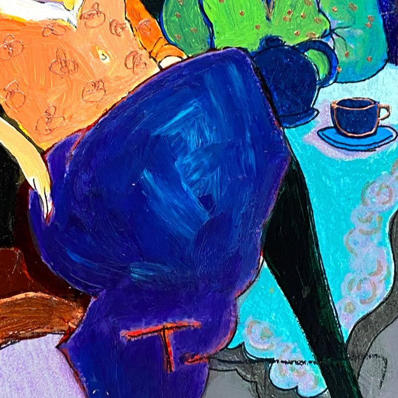 "Sisters" is a one-of-a-kind mixed media over paint on wood by Itzchak Tarkay (1935-2012), hand signed by the artist. Includes Letter of Authenticity. Measures approx. 9" x 9" (image).