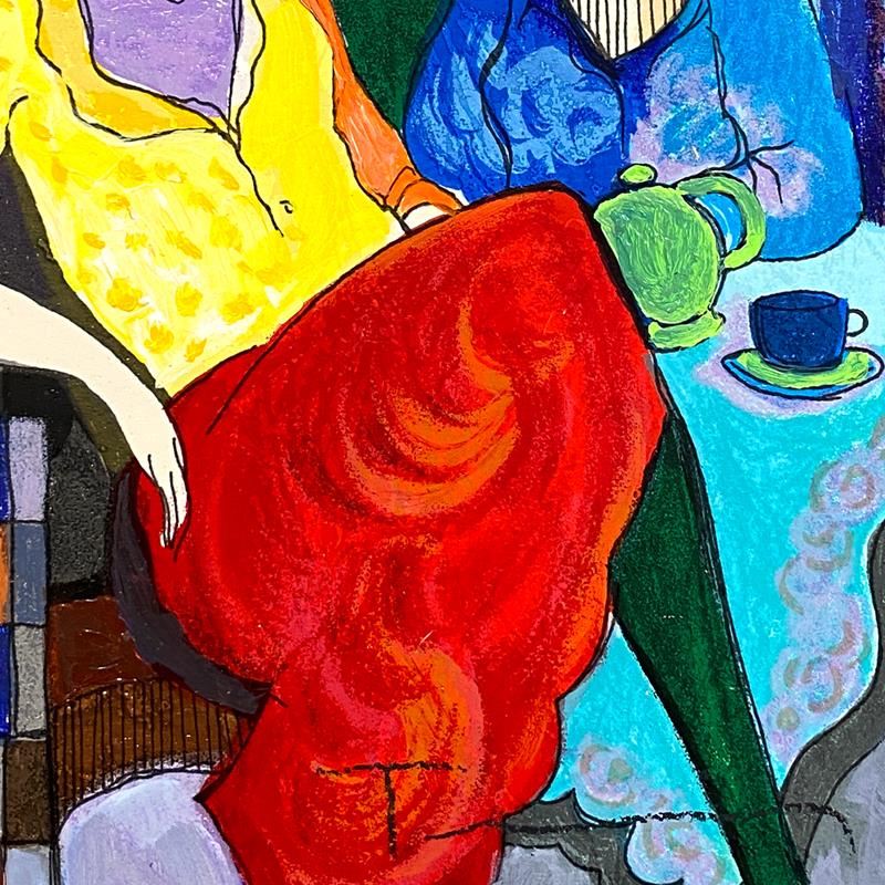 "Sisters" is a one-of-a-kind mixed media over paint on wood by Itzchak Tarkay (1935-2012), hand signed by the artist. Includes Letter of Authenticity. Measures approx. 9" x 9" (image).