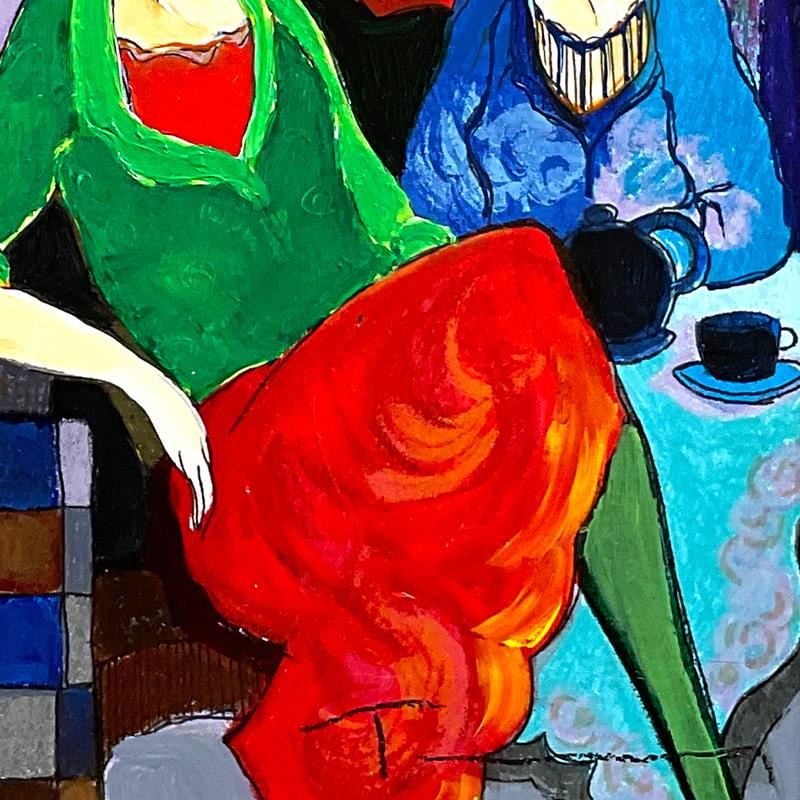 "Sisters" is a one-of-a-kind mixed media over paint on wood by Itzchak Tarkay (1935-2012), hand signed by the artist. This piece comes custom framed. Includes Letter of Authenticity. Measures approx. 13.5" x 13.5" (frame), 8.5" x 8.5" (image).