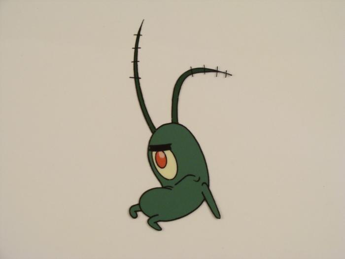This original animation cel is from the Nickelodeon TV show SpongeBob Squarepants. The story takes place under the deep blue sea in Bikini Bottom, where SpongeBob resides. SpongeBob, who is a yellow, porous sponge, is your typical happy-go-lucky character, as he is always cheerful and enjoys making people laugh. Patrick Star, SpongeBob's neighbor who is a starfish, is your average children's show idiot, as he boasts knowing nothing and is often getting himself into ridiculous situations. Between the homes of these two lies the home of the miserable Squidward, a squid, who is known for being grouchy and playing tricks on SpongeBob and Patrick. Both SpongeBob and Squidward work at the Krusty Krab, a fast food business run by the greedy money-loving Mr. Krabs, a crab, the arch rival of the evil, possibly misunderstood, Plankton. Another neighbor, Sandy Cheeks, an athletic squirrel who normally wears an astronaut's space suit, was introduced in "Tea at the Treedome." She spends most of her time inventing and experimenting. Plankton is sitting down.Original Production Animated Cel Overall Size of Cel: 10 1/2" x 12 1/2" Very Good ConditionThis is an original hand-painted cel set-up used in the production of an episode of "SpongeBob SquarePants." Each one-of-a-kind set-up represents a slight change in position of the characters. When individually photographed and projected in rapid succession, the images appear to move.
