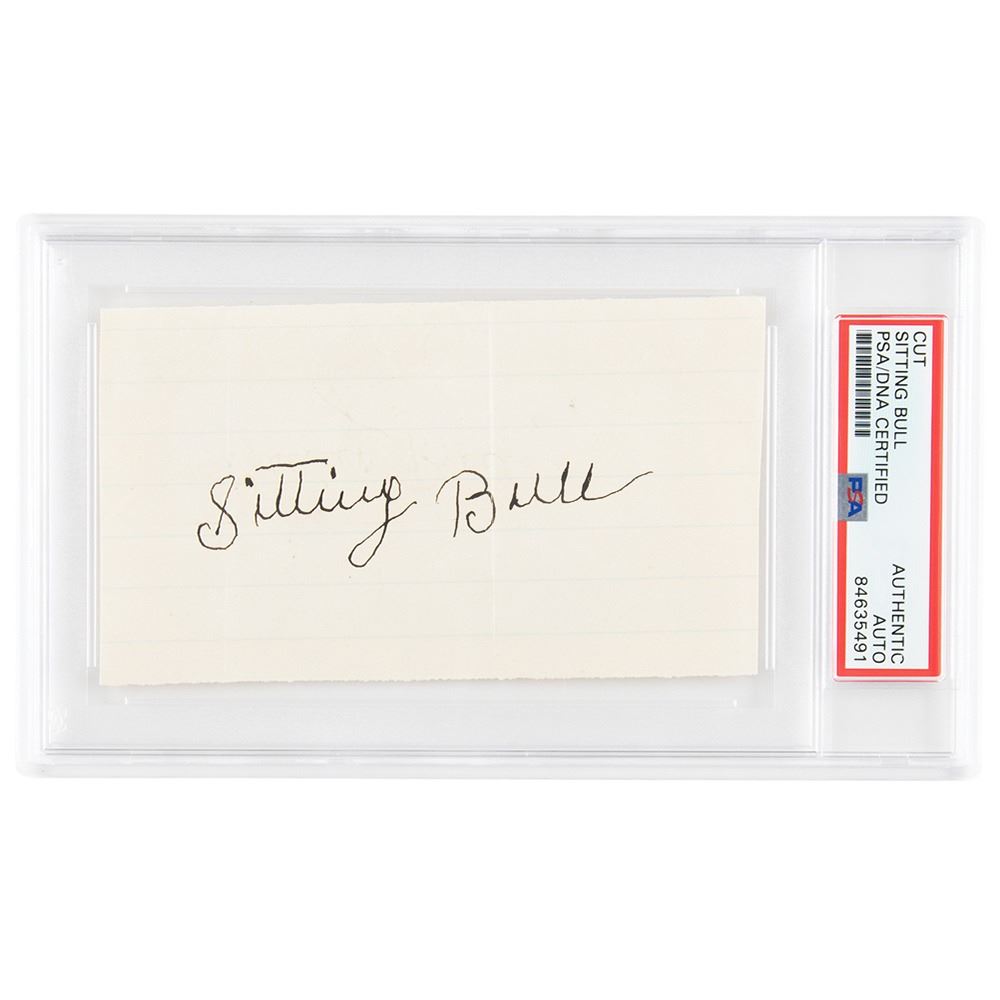 Crisply penned ink signature, "Sitting Bull,†on an off-white 5 x 2.75 sheet of notebook paper. In fine condition, with two vertical folds. Encapsulated in a PSA/DNA authentication holder. Sitting Bull joined Buffalo Bill's Wild West Show in 1885 and stayed for just four months. Despite enduring taunts from the audience that identified him with the massacre at Custer's Last Stand, he was able to earn a small fortune by selling his autograph to curiosity seekers attending the show.