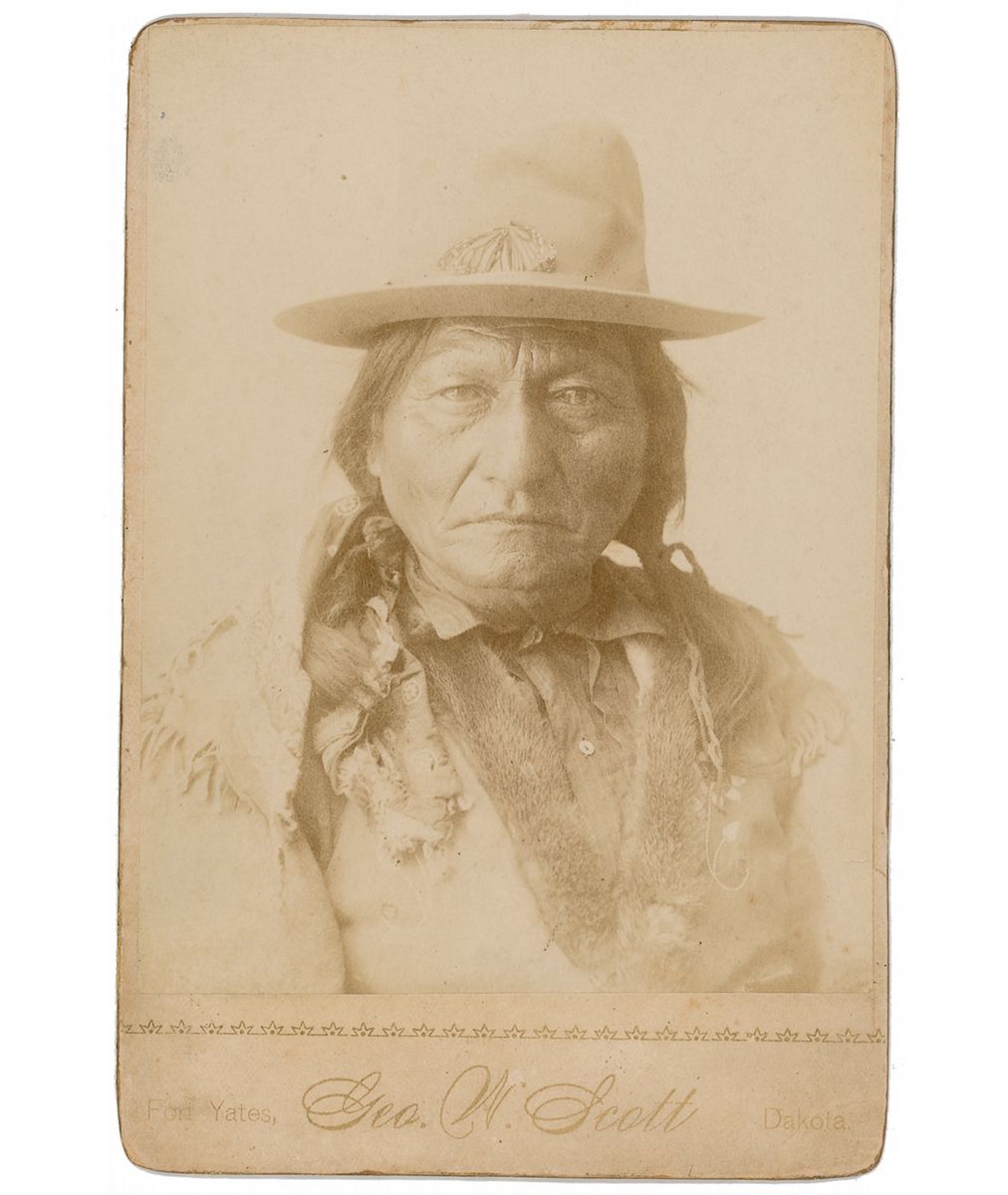 Hunkpapa Lakota Sioux holy man (circa 1831–1890) known for his steadfast opposition to the intrusion of the U.S. government into Sioux lands. Sitting Bull’s “vision” of the defeat of American troops prior to the Battle of Little Bighorn proved prescient, indeed, and it was largely through his leadership and inspiration that the Cheyenne and Sioux decisively overcame Custer’s 7th Cavalry. Fleeing to Canada following the battle, Sitting Bull later returned to the U.S. and toured with Buffalo Bill’s Wild West Show. Fearing his growing influence, government agents fatally shot him during an arrest attempt at Standing Rock Agency on December 15, 1890. Very rare original 4.25 x 6.5 cabinet bust portrait, imprinted in the bottom border, “Geo. W. Scott, Fort Yates, Dakota,” signed on the reverse in black ink, “Sitting Bull.” Collector’s notation at top of reverse reads, “Autograph of Famous Sioux Indian War Chief Sitting Bull.” Scattered light rubbing and surface marks to image, some light toning and soiling to bottom border, and an even shade of mild toning to reverse, otherwise fine condition.