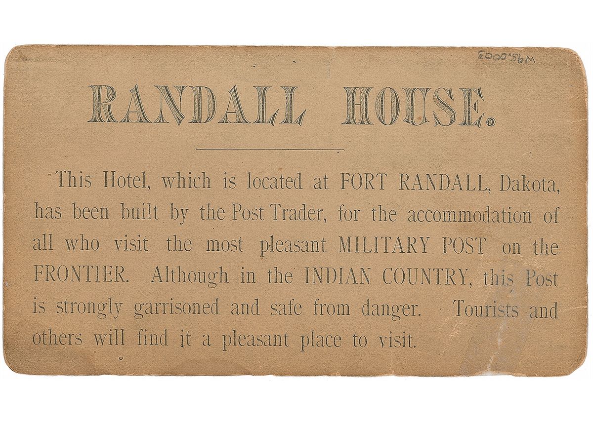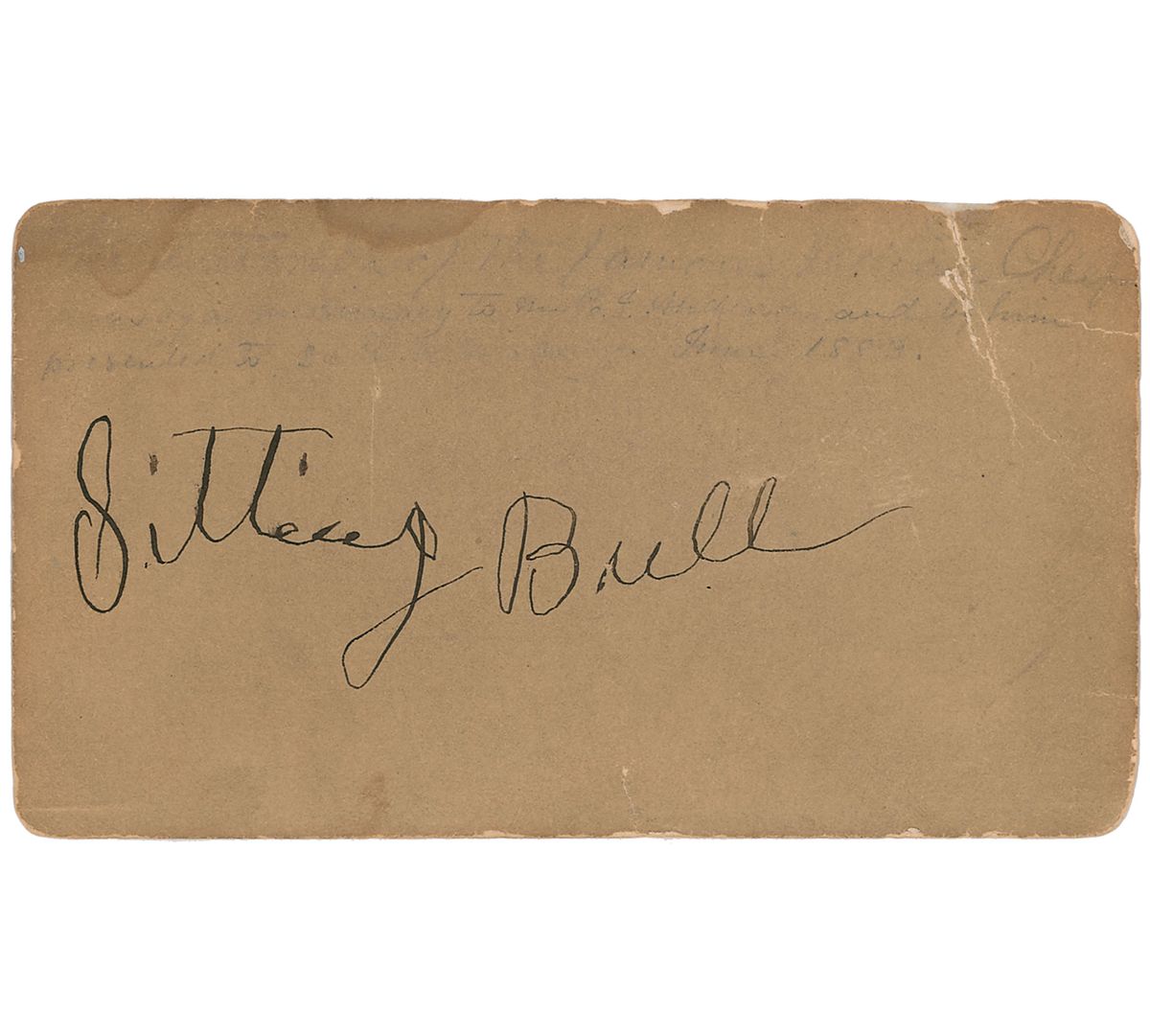 Extremely rare ink signature, “Sitting Bull,” on the reverse of a light brown 4.5 x 2.5 Randall House hotel promotional card. Above the signature is a three-line dated pencil notation in an unknown hand which has mostly faded, and reads, in part, “Autograph of the famous Indian Chief / …to Mr. C.J. Andrews–and by him / presented to…June 1883.” Printed on the front of the card, the information reads, “This Hotel, which is located at Fort Randall, Dakota, has been built by the Post Trader, for the accommodation of all who visit the most pleasant MILITARY POST on the FRONTIER. Although in the INDIAN COUNTRY, this Post is strongly garrisoned and safe from danger. Tourists and others will find it a pleasant place to visit.” In fine condition, with some minor chipping and age wear to card and a crease to top edge, well away from the crisp and bold signature.